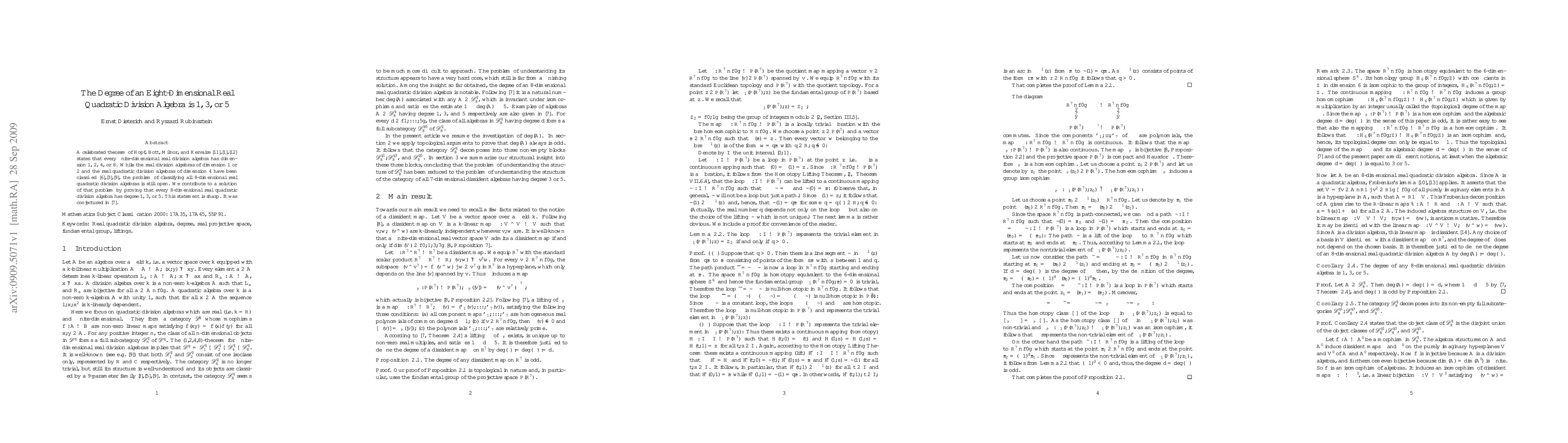 A celebrated theorem of Hopf, Bott, Milnor, and Kervaire states that every finite-dimensional real division algebra has dimension 1, 2, 4, or 8. While the real division algebras of dimension 1 or 2 and the real quadratic division algebras of dimension 4 have been classified, the problem of classifying all 8-dimensional real quadratic division algebras is still open. We contribute to a solution of that problem by proving that every 8-dimensional real quadratic division algebra has degree 1, 3, or 5. This statement is sharp.