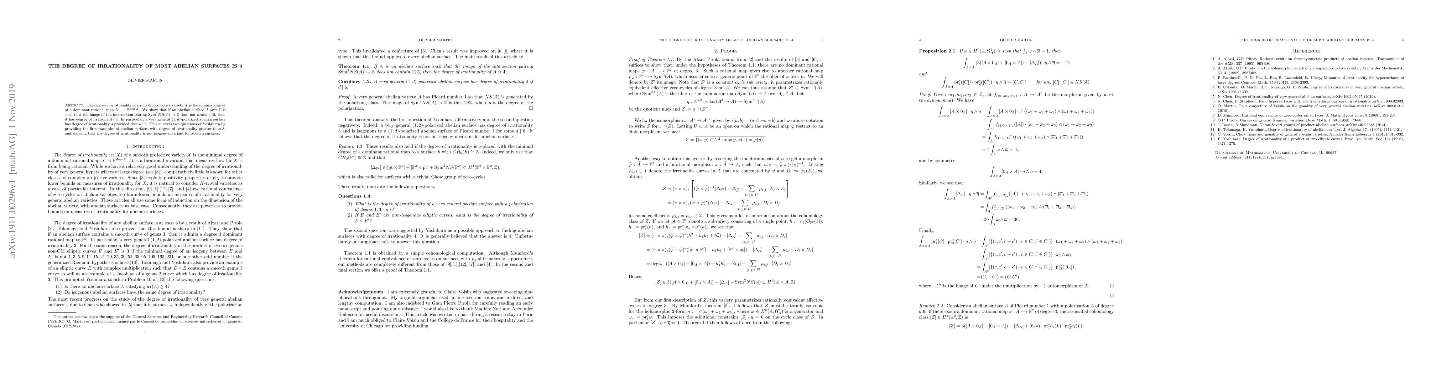 This paper demonstrates that most abelian surfaces have a degree of irrationality of 4, defined as the minimal degree of a dominant rational map to projective space. It provides examples of such surfaces where the intersection pairing does not include 12, thus confirming that these surfaces have degree of irrationality greater than 3 and are not isogeny-invariant.