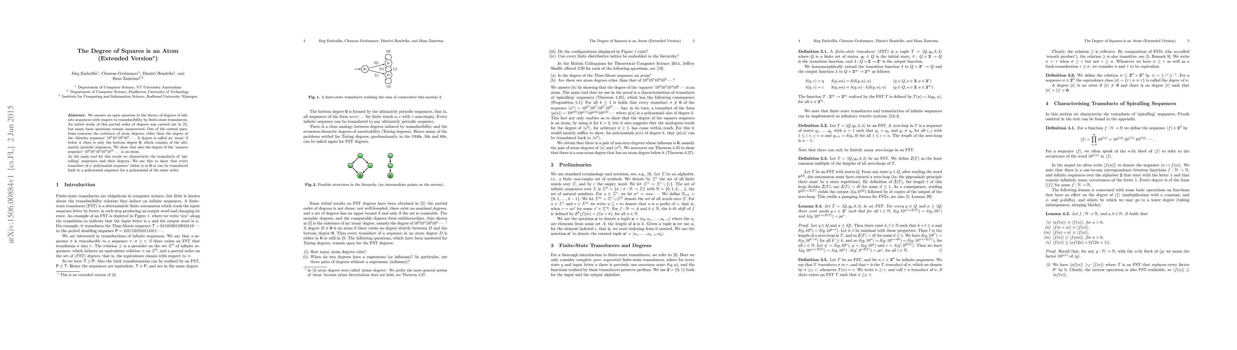 We answer an open question in the theory of degrees of infinite sequences with respect to transducibility by finite-state transducers. An initial study of this partial order of degrees was carried out in (Endrullis, Hendriks, Klop, 2011), but many basic questions remain unanswered. One of the central questions concerns the existence of atom degrees, other than the degree of the `identity sequence' 1 0^0 1 0^1 1 0^2 1 0^3 .... A degree is called an `atom' if below it there is only the bottom degree 0, which consists of the ultimately periodic sequences. We show that also the degree of the `squares sequence' 1 0^0 1 0^1 1 0^4 1 0^9 1 0^{16} ... is an atom. As the main tool for this result we characterise the transducts of `spiralling' sequences and their degrees. We use this to show that every transduct of a `polynomial sequence' either is in 0 or can be transduced back to a polynomial sequence for a polynomial of the same order.