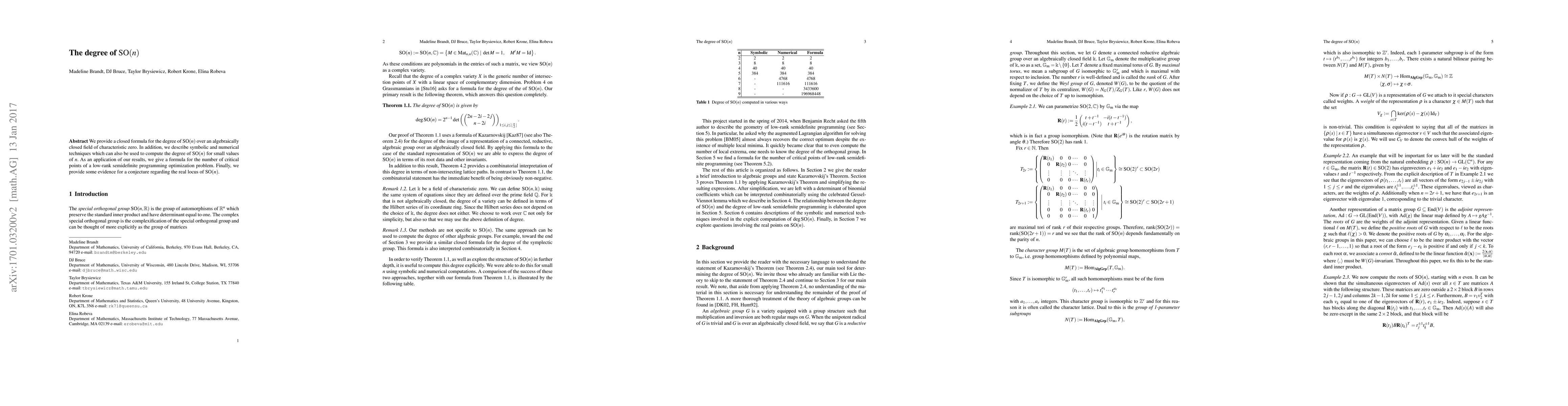 We provide a closed formula for the degree of $\text{SO}(n)$ over an algebraically closed field of characteristic zero. In addition, we describe symbolic and numerical techniques which can also be used to compute the degree of $\text{SO}(n)$ for small values of $n$. As an application of our results, we give a formula for the number of critical points of a low-rank semidefinite programming optimization problem. Finally, we provide some evidence for a conjecture regarding the real locus of $\text{SO}(n)$.