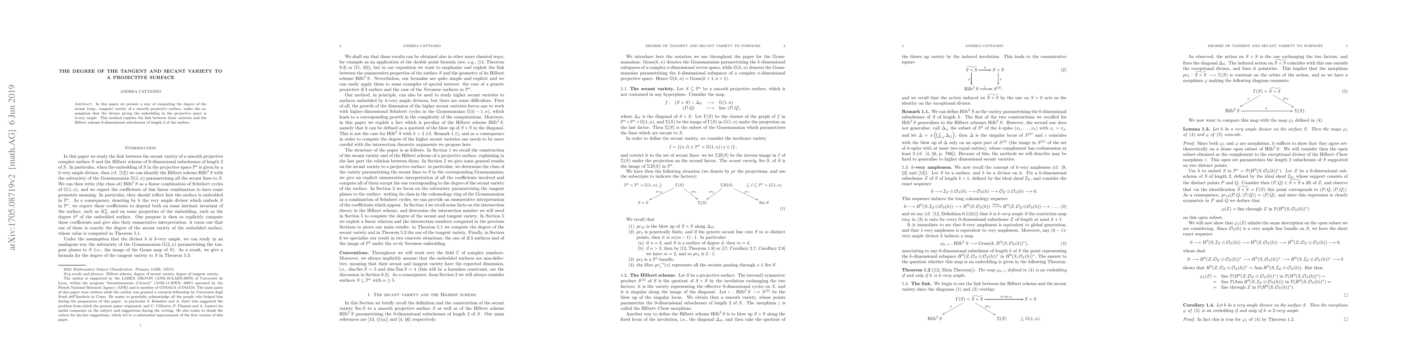 This paper develops a method to compute the degree of the tangent and secant varieties of a smooth projective surface, leveraging the connection to $0$-dimensional subschemes of length $2$ via the Hilbert scheme, under the condition that the embedding divisor is $3$-very ample.
