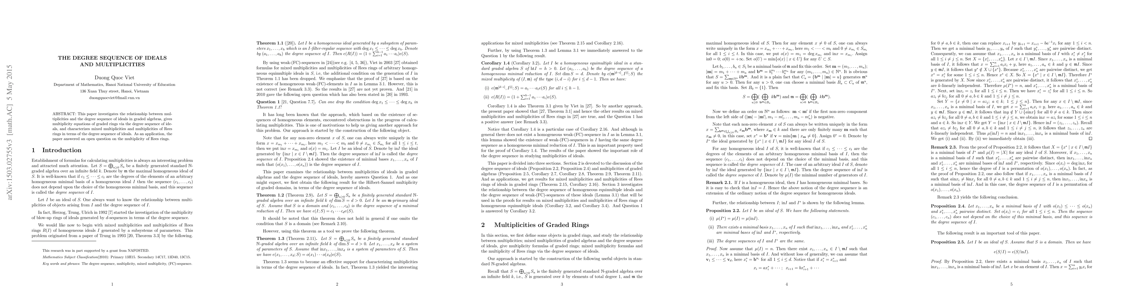This paper explores the relationship between multiplicities and the degree sequence of ideals in graded algebras, providing equations for graded rings' multiplicities through the degree sequence of ideals, and characterizing mixed multiplicities and Rees rings' multiplicities. It also resolves an open question regarding the multiplicity of Rees rings.