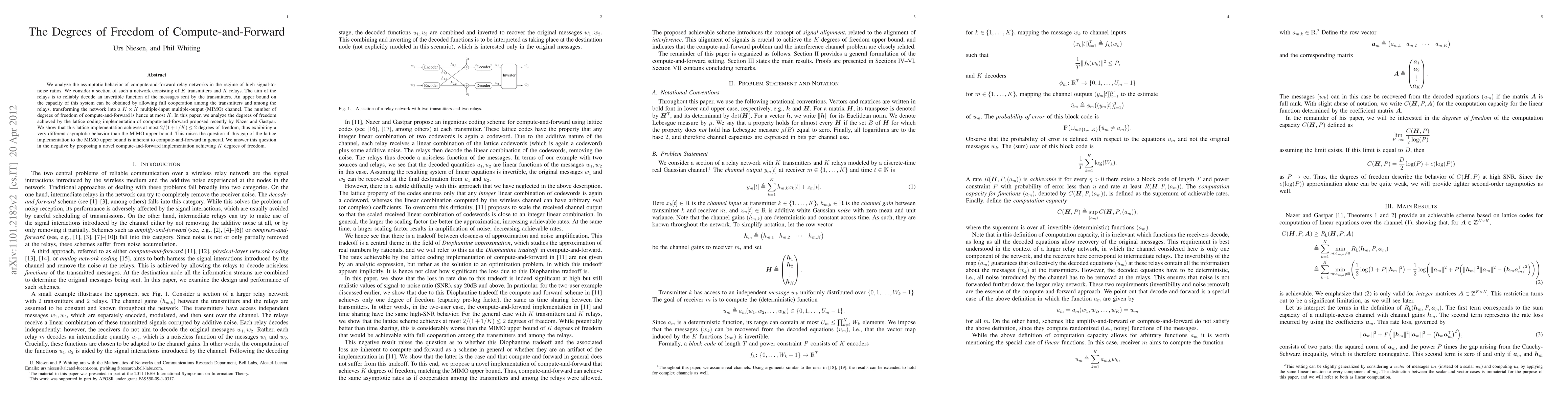 We analyze the asymptotic behavior of compute-and-forward relay networks in the regime of high signal-to-noise ratios. We consider a section of such a network consisting of K transmitters and K relays. The aim of the relays is to reliably decode an invertible function of the messages sent by the transmitters. An upper bound on the capacity of this system can be obtained by allowing full cooperation among the transmitters and among the relays, transforming the network into a K times K multiple-input multiple-output (MIMO) channel. The number of degrees of freedom of compute-and-forward is hence at most K. In this paper, we analyze the degrees of freedom achieved by the lattice coding implementation of compute-and-forward proposed recently by Nazer and Gastpar. We show that this lattice implementation achieves at most 2/(1+1/K)\leq 2 degrees of freedom, thus exhibiting a very different asymptotic behavior than the MIMO upper bound. This raises the question if this gap of the lattice implementation to the MIMO upper bound is inherent to compute-and-forward in general. We answer this question in the negative by proposing a novel compute-and-forward implementation achieving K degrees of freedom.