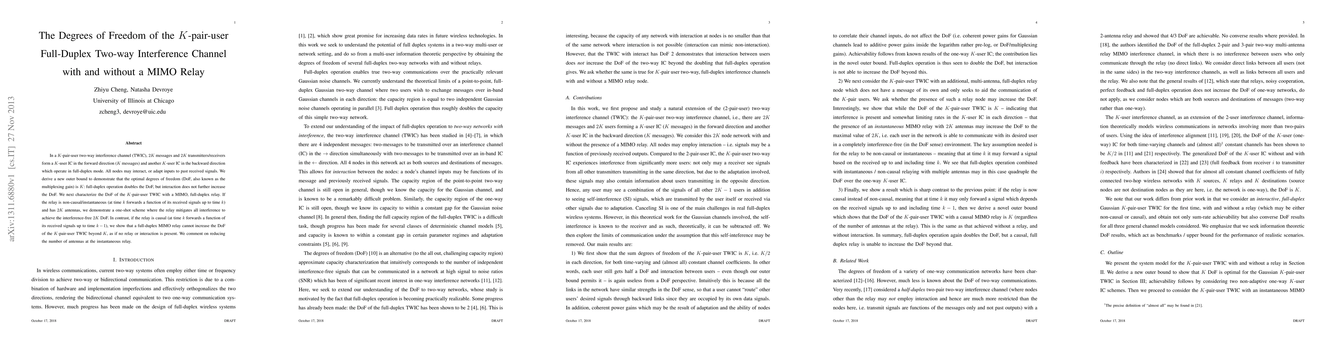 In a $K$-pair-user two-way interference channel (TWIC), $2K$ messages and $2K$ transmitters/receivers form a $K$-user IC in the forward direction ($K$ messages) and another $K$-user IC in the backward direction which operate in full-duplex mode. All nodes may interact, or adapt inputs to past received signals. We derive a new outer bound to demonstrate that the optimal degrees of freedom (DoF, also known as the multiplexing gain) is $K$: full-duplex operation doubles the DoF, but interaction does not further increase the DoF. We next characterize the DoF of the $K$-pair-user TWIC with a MIMO, full-duplex relay. If the relay is non-causal/instantaneous (at time $k$ forwards a function of its received signals up to time $k$) and has $2K$ antennas, we demonstrate a one-shot scheme where the relay mitigates all interference to achieve the interference-free $2K$ DoF. In contrast, if the relay is causal (at time $k$ forwards a function of its received signals up to time $k-1$), we show that a full-duplex MIMO relay cannot increase the DoF of the $K$-pair-user TWIC beyond $K$, as if no relay or interaction is present. We comment on reducing the number of antennas at the instantaneous relay.