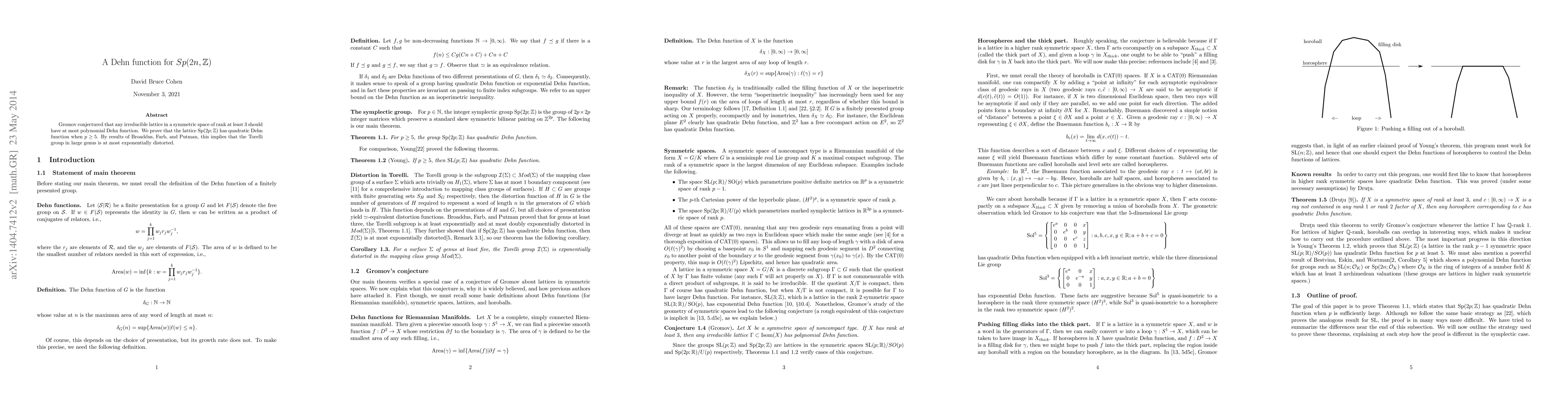 The paper proves that the irreducible lattice Sp(2p;Z) has a quadratic Dehn function for p ≥ 5, supporting Gromov's conjecture on the polynomial Dehn function for such lattices. This result also implies exponential distortion for the Torelli group in large genus.