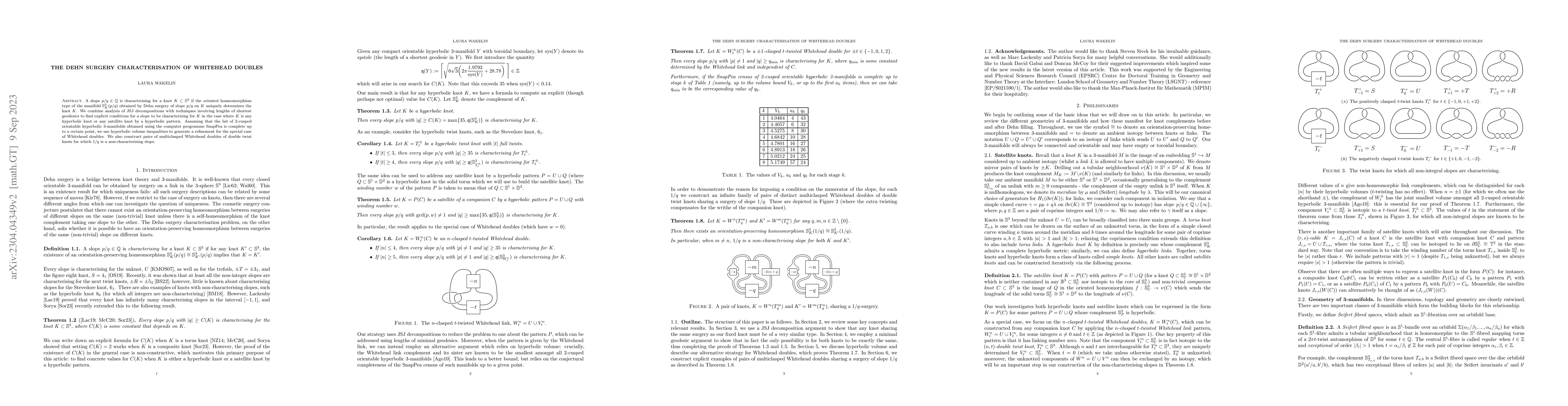 This paper identifies explicit conditions for a slope to characterise hyperbolic knots and satellite knots through Dehn surgery, using JSJ decompositions and hyperbolic volume inequalities. It specifically refines these conditions for Whitehead doubles and demonstrates non-characterising slopes for certain multiclasped variants.