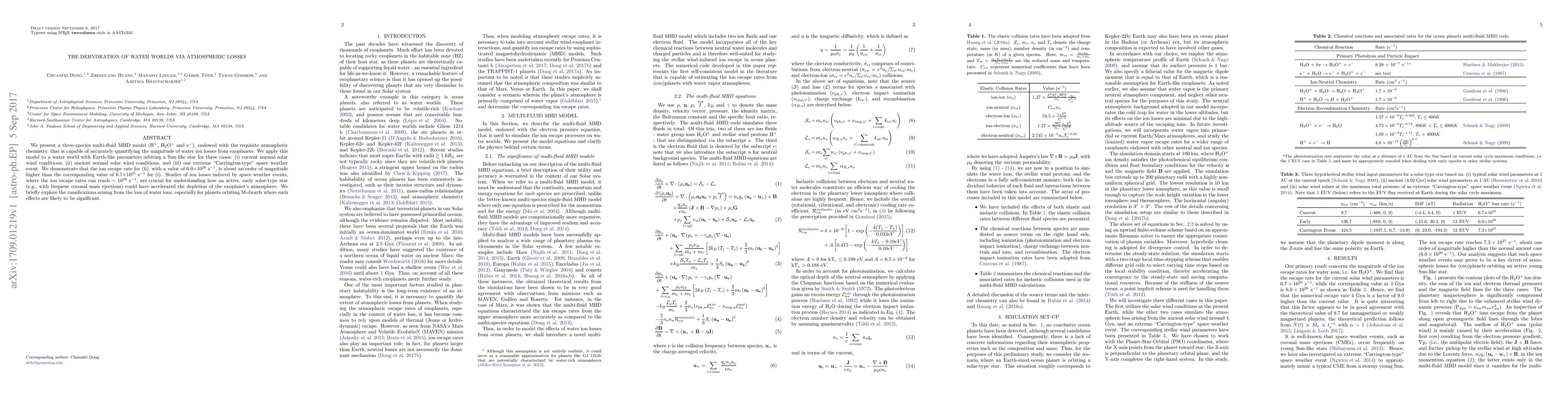 We present a three-species multi-fluid MHD model (H$^+$, H$_2$O$^+$ and e$^-$), endowed with the requisite atmospheric chemistry, that is capable of accurately quantifying the magnitude of water ion losses from exoplanets. We apply this model to a water world with Earth-like parameters orbiting a Sun-like star for three cases: (i) current normal solar wind conditions, (ii) ancient normal solar wind conditions, and (iii) one extreme "Carrington-type" space weather event. We demonstrate that the ion escape rate for (ii), with a value of 6.0$\times$10$^{26}$ s$^{-1}$, is about an order of magnitude higher than the corresponding value of 6.7$\times$10$^{25}$ s$^{-1}$ for (i). Studies of ion losses induced by space weather events, where the ion escape rates can reach $\sim$ 10$^{28}$ s$^{-1}$, are crucial for understanding how an active, early solar-type star (e.g., with frequent coronal mass ejections) could have accelerated the depletion of the exoplanet's atmosphere. We briefly explore the ramifications arising from the loss of water ions, especially for planets orbiting M-dwarfs where such effects are likely to be significant.