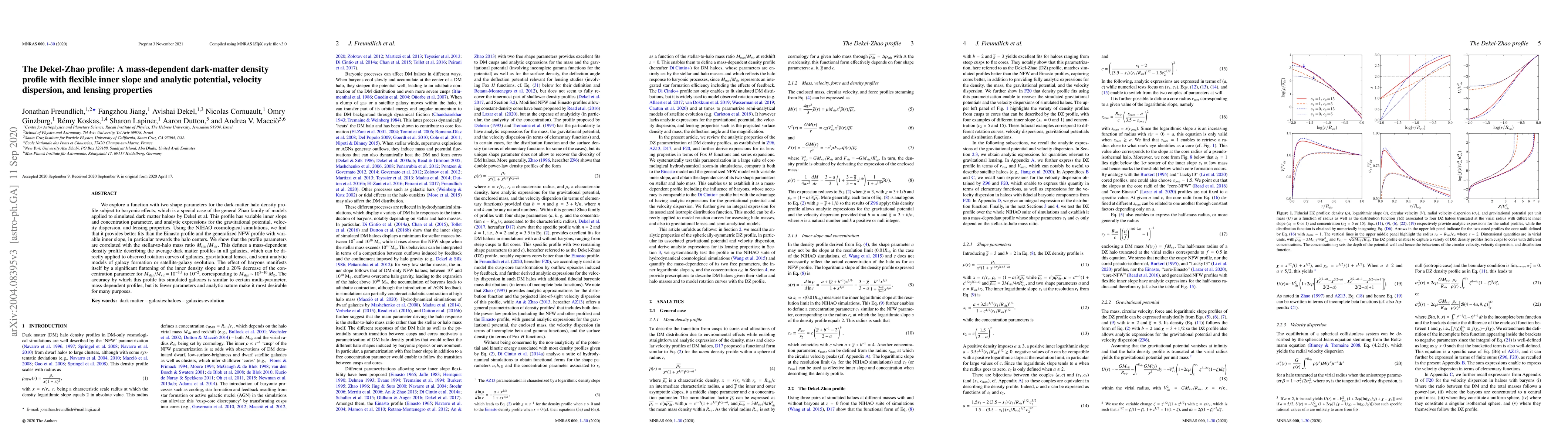 We explore a function with two shape parameters for the dark-matter halo density profile subject to baryonic effects, which is a special case of the general Zhao family of models applied to simulated dark matter haloes by Dekel et al. This profile has variable inner slope and concentration parameter, and analytic expressions for the gravitational potential, velocity dispersion, and lensing properties. Using the NIHAO cosmological simulations, we find that it provides better fits than the Einasto profile and the generalized NFW profile with variable inner slope, in particular towards the halo centers. We show that the profile parameters are correlated with the stellar-to-halo mass ratio $M_{\rm star}/M_{\rm vir}$. This defines a mass-dependent density profile describing the average dark matter profiles in all galaxies, which can be directly applied to observed rotation curves of galaxies, gravitational lenses, and semi-analytic models of galaxy formation or satellite-galaxy evolution. The effect of baryons manifests itself by a significant flattening of the inner density slope and a 20\% decrease of the concentration parameter for $M_{\rm star}/M_{\rm vir} = 10^{-3.5}$ to $10^{-2}$, corresponding to $M_{\rm star} \sim 10^{7-10} M_\odot$. The accuracy by which this profile fits simulated galaxies is similar to certain multi-parameter, mass-dependent profiles, but its fewer parameters and analytic nature make it most desirable for many purposes.