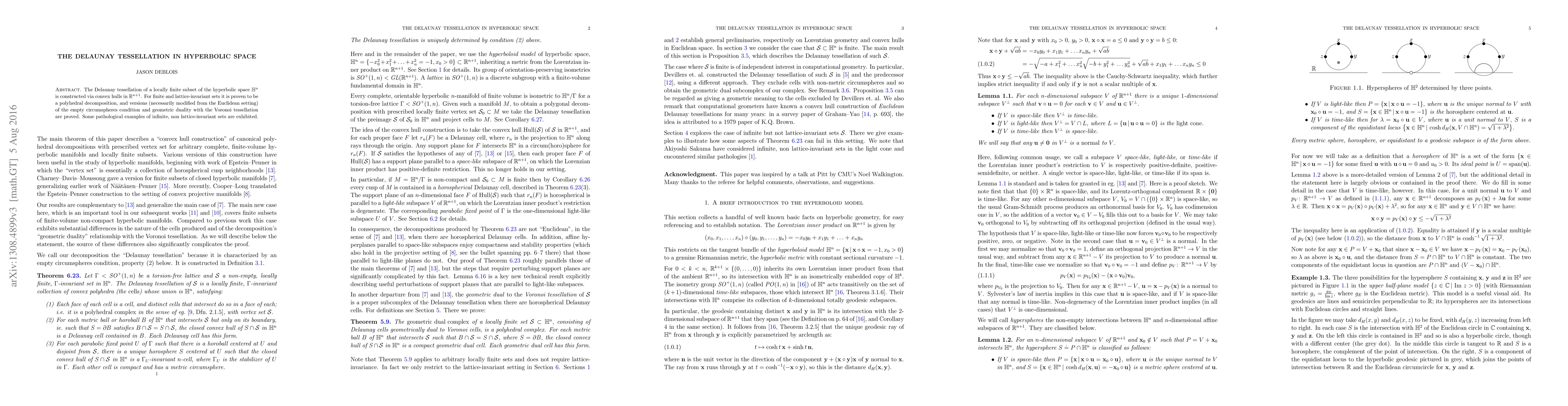 Researchers developed a Delaunay tessellation in hyperbolic space using convex hulls from Euclidean space, proving it's a polyhedral decomposition for finite lattice-invariant sets and exhibiting pathological examples of infinite non-lattice-invariant sets.