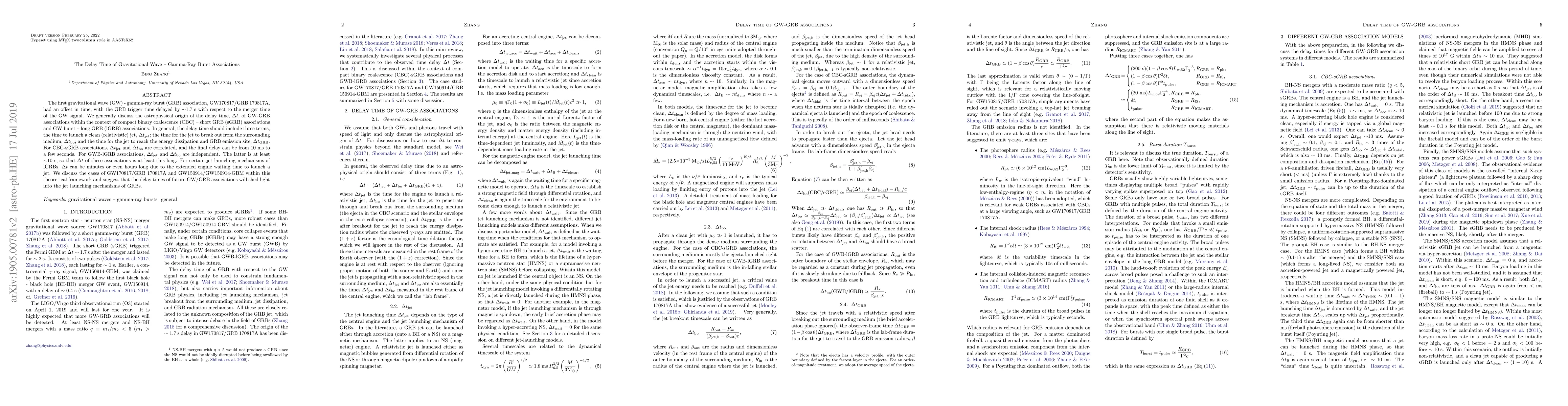 The delay time between gravitational waves and gamma-ray bursts is studied in two associations, with delays ranging from 10 milliseconds to over an hour, suggesting different jet launching mechanisms for short and long GRBs.