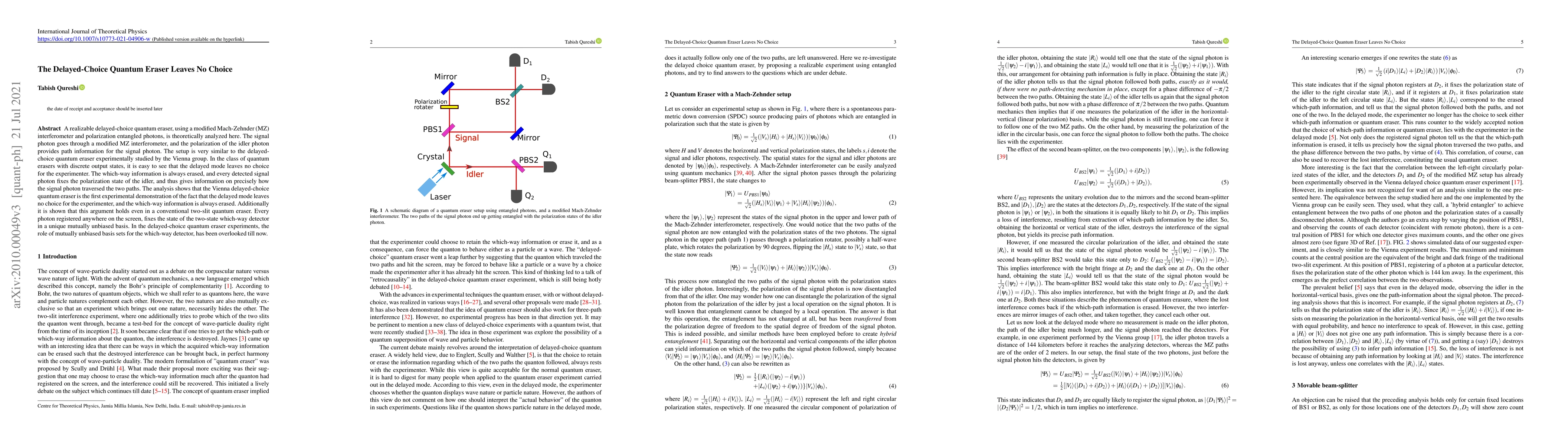 This paper analyzes a modified delayed-choice quantum eraser using a Mach-Zehnder interferometer and polarization entangled photons, demonstrating that the delayed mode always erases which-way information, leaving no choice for the experimenter. It highlights the significance of mutually unbiased basis sets in determining the path information of signal photons.