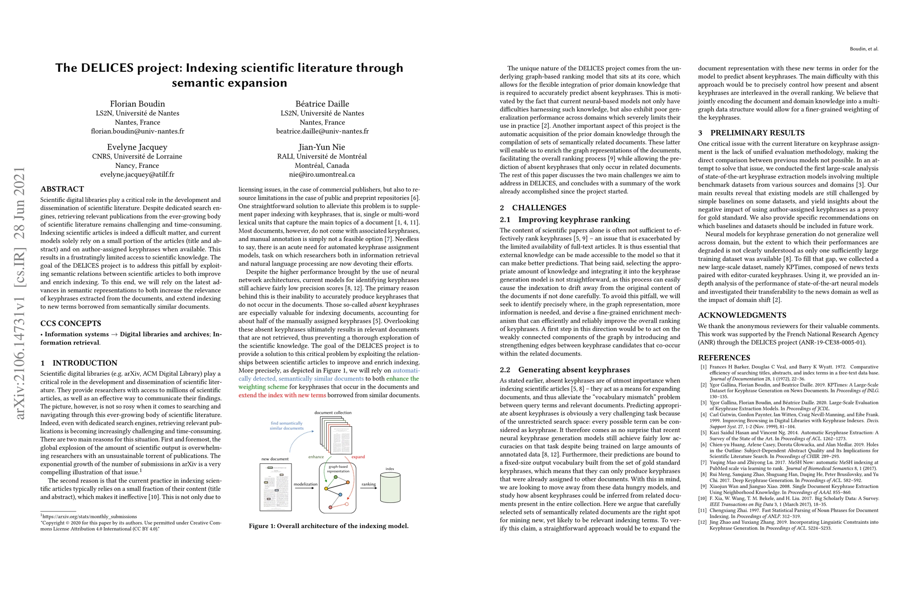 Scientific digital libraries play a critical role in the development and dissemination of scientific literature. Despite dedicated search engines, retrieving relevant publications from the ever-growing body of scientific literature remains challenging and time-consuming. Indexing scientific articles is indeed a difficult matter, and current models solely rely on a small portion of the articles (title and abstract) and on author-assigned keyphrases when available. This results in a frustratingly limited access to scientific knowledge. The goal of the DELICES project is to address this pitfall by exploiting semantic relations between scientific articles to both improve and enrich indexing. To this end, we will rely on the latest advances in semantic representations to both increase the relevance of keyphrases extracted from the documents, and extend indexing to new terms borrowed from semantically similar documents.