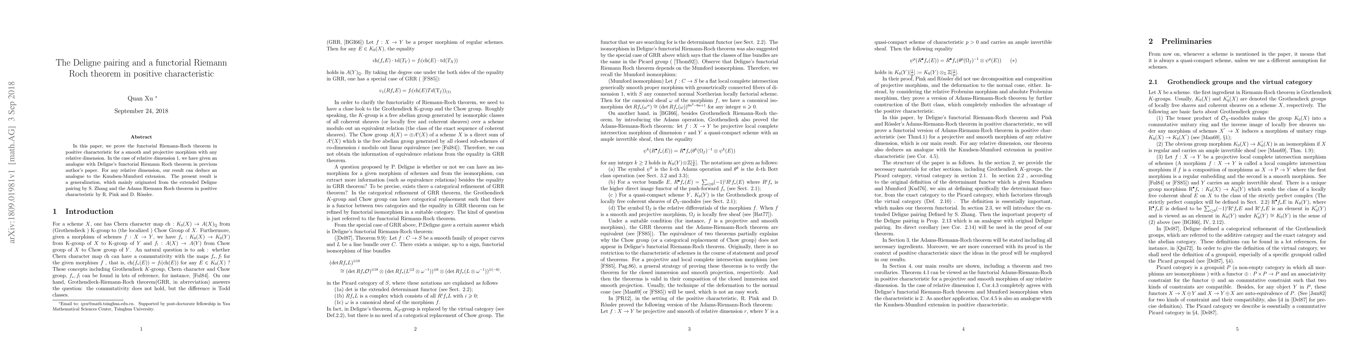 This paper proves a functorial Riemann-Roch theorem in positive characteristic for smooth and projective morphisms of any relative dimension, generalizing previous results and extending the Deligne pairing and Adams Riemann Roch theorem. The findings also provide an analogue to the Knudsen-Mumford extension for any relative dimension.