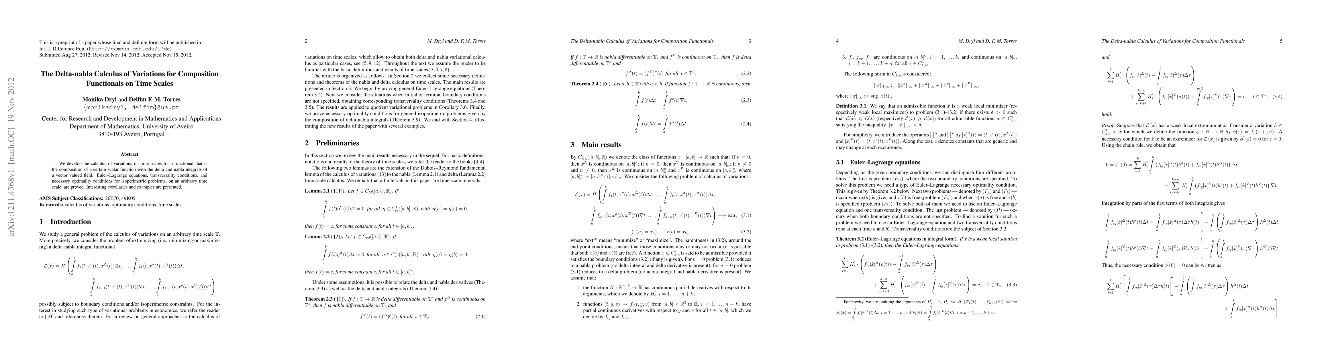 We develop the calculus of variations on time scales for a functional that is the composition of a certain scalar function with the delta and nabla integrals of a vector valued field. Euler-Lagrange equations, transversality conditions, and necessary optimality conditions for isoperimetric problems, on an arbitrary time scale, are proved. Interesting corollaries and examples are presented.