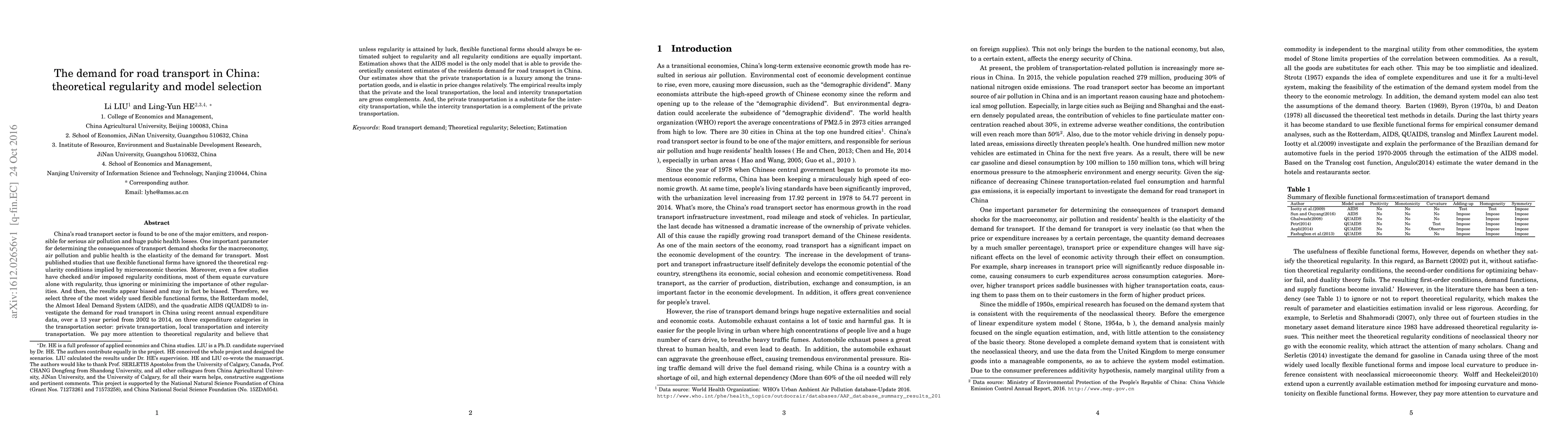 Road transport sector is found to be one of the major emitters, and responsible for serious air pollution and huge pubic health losses. One important parameter for determining the consequences of transport demand shocks for the macroeconomy, air pollution and public health is the elasticity of the demand for transport. Most published studies that use flexible functional forms have ignored the theoretical regularity conditions implied by microeconomic theories. Moreover, even a few studies have checked and/or imposed regularity conditions, most of them equate curvature alone with regularity, thus ignoring or minimizing the importance of other regularities. And then, the results appear biased and may in fact be biased. Therefore, we select three of the most widely used flexible functional forms, the Rotterdam model, the Almost Ideal Demand System (AIDS), and the quadratic AIDS (QUAIDS) to investigate the demand for road transport in China using recent annual expenditure data, over a 13 year period from 2002 to 2014, on three expenditure categories in the transportation sector: private transportation, local transportation and intercity transportation. Estimation shows that the AIDS model is the only model that is able to provide theoretically consistent estimates of the residents demand for road transport in China. Our estimates show that the private transportation is a luxury among the transportation goods, and is elastic in price changes relatively. The empirical results imply that the private and the local transportation, the local and intercity transportation are gross complements. And, the private transportation is a substitute for the inter-city transportation, while the intercity transportation is a complement of the private transportation.
