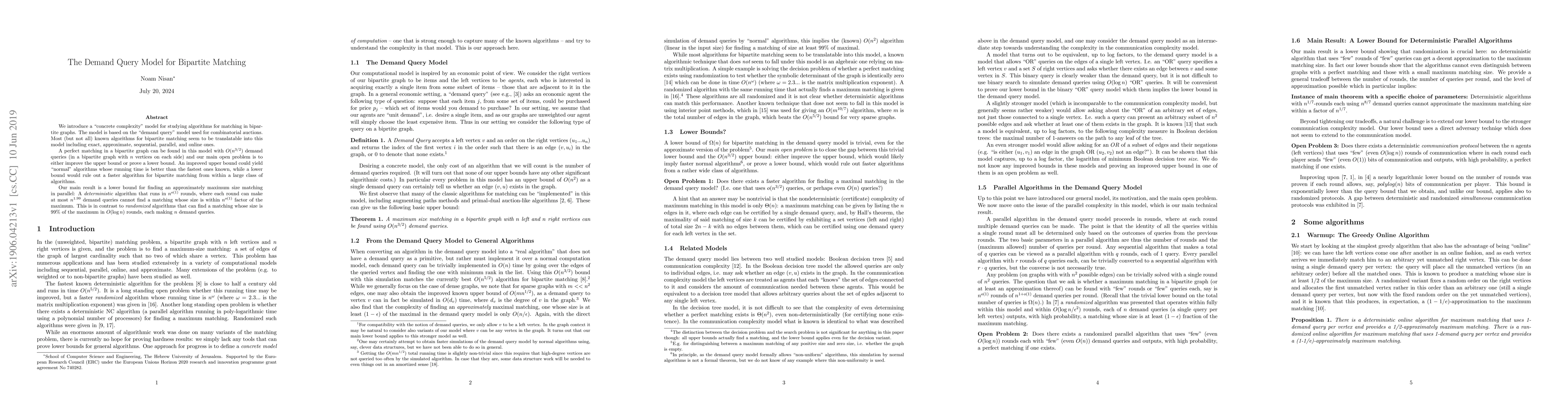 The paper introduces a "demand query" model for studying bipartite matching algorithms, showing that most known algorithms fit within this framework. The main result establishes a lower bound for parallel algorithms, proving they cannot find an approximate maximum matching in significantly fewer rounds than randomized algorithms can.