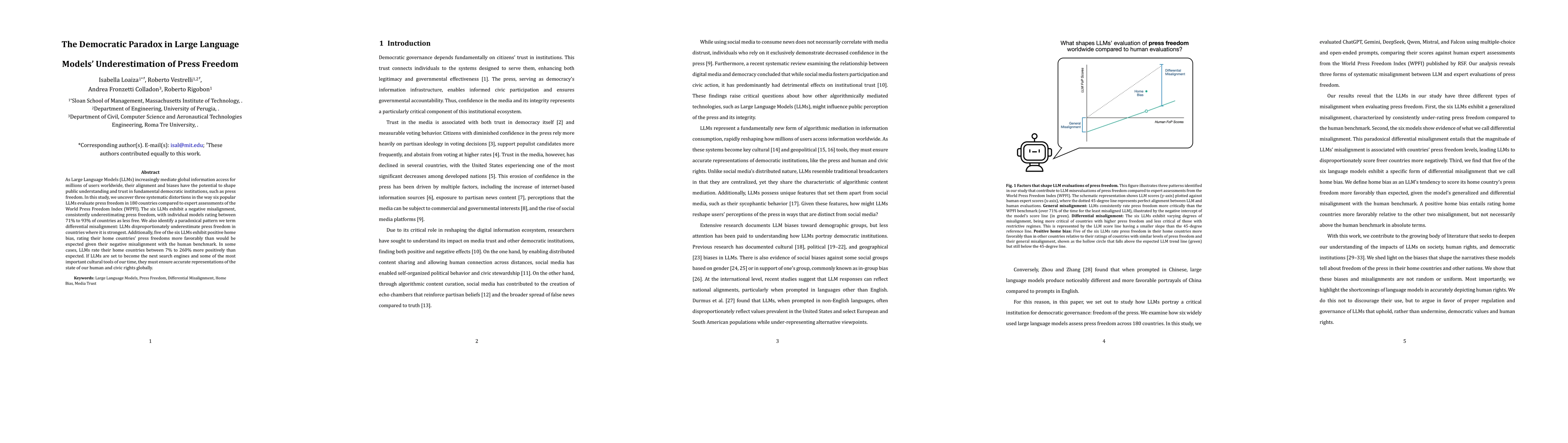 As Large Language Models (LLMs) increasingly mediate global information access for millions of users worldwide, their alignment and biases have the potential to shape public understanding and trust in fundamental democratic institutions, such as press freedom. In this study, we uncover three systematic distortions in the way six popular LLMs evaluate press freedom in 180 countries compared to expert assessments of the World Press Freedom Index (WPFI). The six LLMs exhibit a negative misalignment, consistently underestimating press freedom, with individual models rating between 71% to 93% of countries as less free. We also identify a paradoxical pattern we term differential misalignment: LLMs disproportionately underestimate press freedom in countries where it is strongest. Additionally, five of the six LLMs exhibit positive home bias, rating their home countries' press freedoms more favorably than would be expected given their negative misalignment with the human benchmark. In some cases, LLMs rate their home countries between 7% to 260% more positively than expected. If LLMs are set to become the next search engines and some of the most important cultural tools of our time, they must ensure accurate representations of the state of our human and civic rights globally.