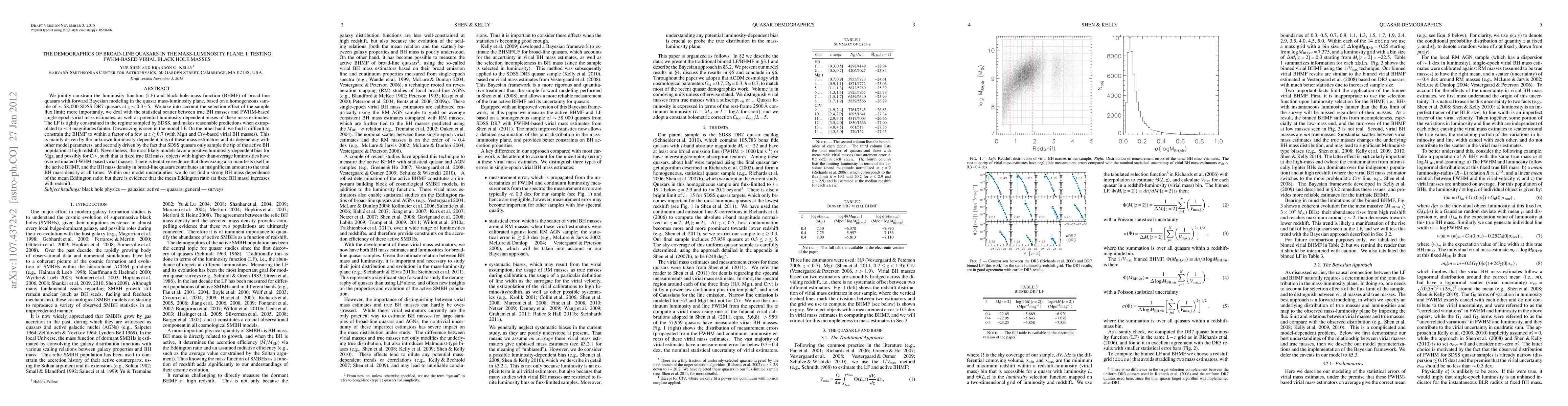 Researchers used a sample of 58,000 quasars to constrain the relationship between black hole mass and luminosity in the mass-luminosity plane, finding that downsizing affects the distribution of broad-line quasars and that there is tentative evidence for luminosity-dependent biases in virial mass estimates.