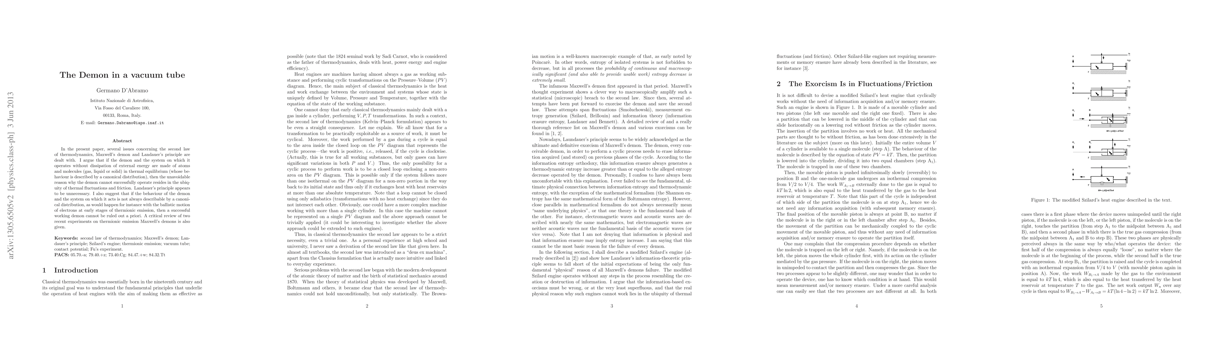 In the present paper, several issues concerning the second law of thermodynamics, Maxwell's demon and Landauer's principle are dealt with. I argue that if the demon and the system on which it operates without dissipation of external energy are made of atoms and molecules (gas, liquid or solid) in thermal equilibrium (whose behaviour is described by a canonical distribution), then the unavoidable reason why the demon cannot successfully operate resides in the ubiquity of thermal fluctuations and friction. Landauer's principle appears to be unnecessary. I also suggest that if the behaviour of the demon and the system on which it acts is not always describable by a canonical distribution, as would happen for instance with the ballistic motion of electrons at early stages of thermionic emission, then a successful working demon cannot be ruled out a priori. A critical review of two recent experiments on thermionic emission Maxwell's demons is also given.