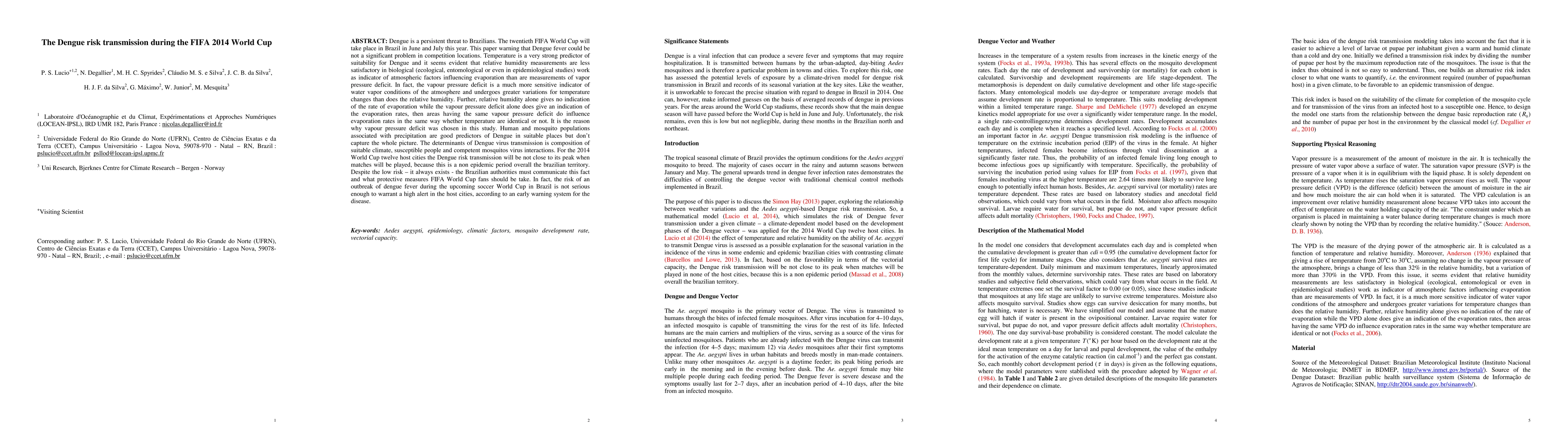 Dengue is a viral infection that can produce a severe fever and symptoms that may require hospitalization. It is transmitted between humans by the urban-adapted, day-biting Aedes mosquitoes and is therefore a particular problem in towns and cities. To explore this risk, one has assessed the potential levels of exposure by a climate-driven model for dengue risk transmission in Brazil and records of its seasonal variation at the key sites. Like the weather, it is unworkable to forecast the precise situation with regard to dengue in Brazil in 2014. One can, however, make informed guesses on the basis of averaged records of dengue in previous years. For the areas around the World Cup stadiums, these records show that the main dengue season will have passed before the World Cup is held in June and July. Unfortunately, the risk remains, even this is low but not negliegible, during these months in the Brazilian north and northeast. But, in fact, the risk of an outbreak of dengue fever during the upcoming soccer World Cup in Brazil is not serious enough to warrant a high alert in the host cities, according to a reliable early warning system for the disease.