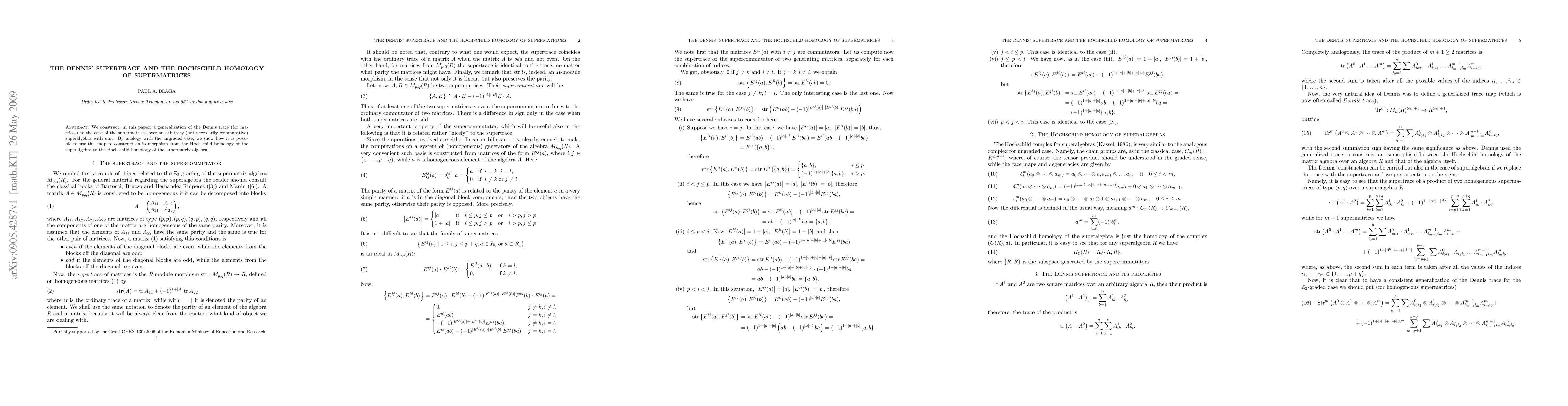 We construct, in this paper, a generalization of the Dennis trace (for matrices) to the case of the supermatrices over an arbitrary (not necessarily commutative) superalgebra with unit. By analogy with the ungraded case, we show how it is possible to use this map to construct an isomorphism from the Hochschild homology of the superalgebra to the Hochschild homology of the supermatrix algebra.