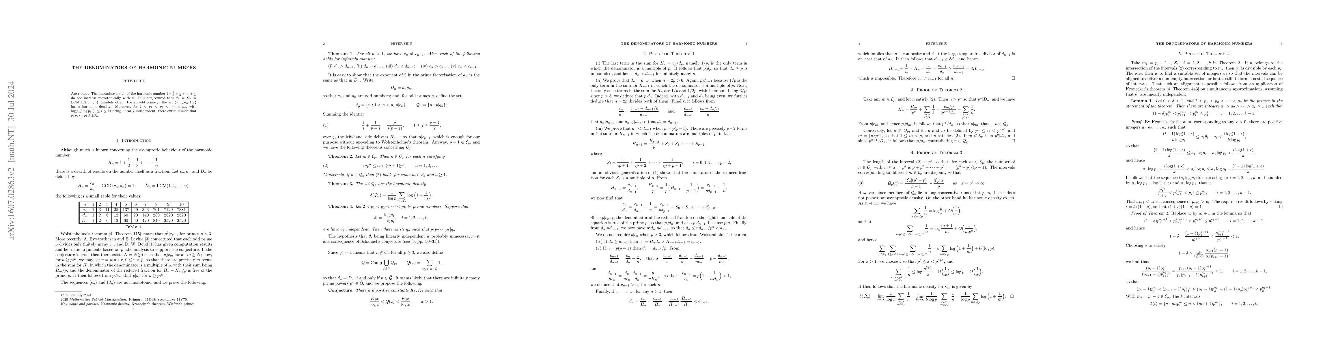 The denominators of harmonic numbers do not increase monotonically with n, but it is conjectured that they equal the LCM of 1 to n infinitely often. The set of n where a product of primes divides the harmonic number has a harmonic density and exists for any combination of primes.