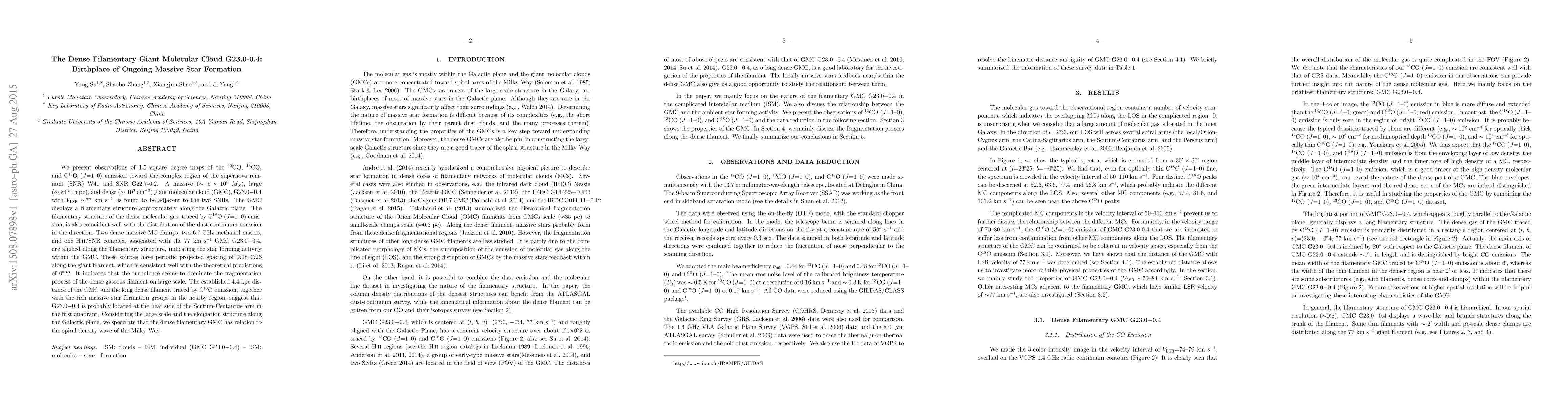 This paper presents observations of the dense filamentary giant molecular cloud G23.0-0.4, adjacent to supernova remnants W41 and G22.7-0.2, indicating massive star formation activity. The cloud's filamentary structure aligns with dust-continuum emission and supports turbulence-driven fragmentation, suggesting a relation to the Milky Way's spiral density wave.