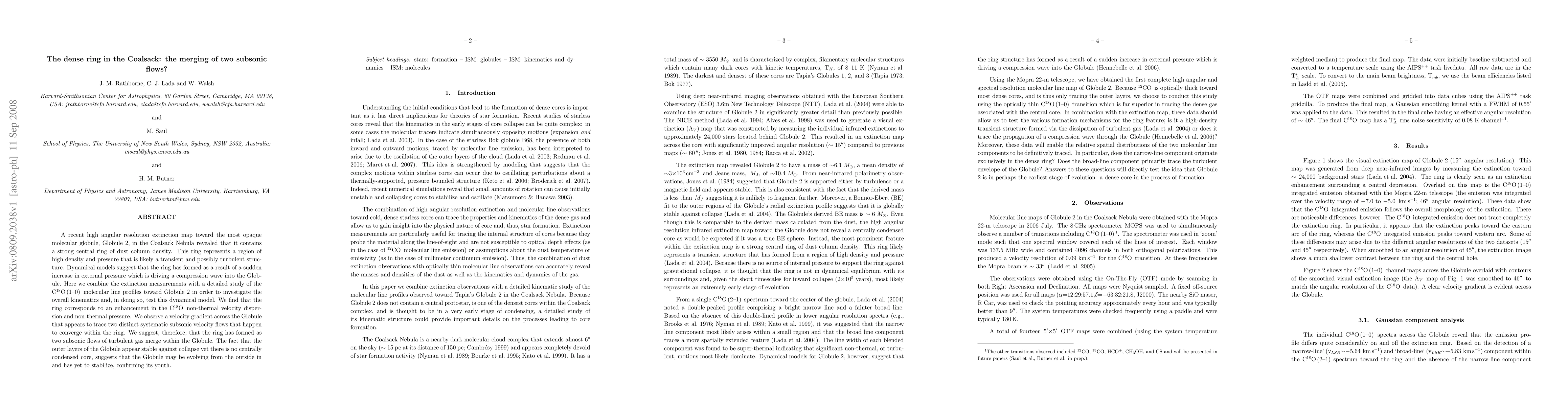 A recent high angular resolution extinction map toward the most opaque molecular globule, Globule 2, in the Coalsack Nebula revealed that it contains a strong central ring of dust column density. This ring represents a region of high density and pressure that is likely a transient and possibly turbulent structure. Dynamical models suggest that the ring has formed as a result of a sudden increase in external pressure which is driving a compression wave into the Globule. Here we combine the extinction measurements with a detailed study of the C18O (1-0) molecular line profiles toward Globule 2 in order to investigate the overall kinematics and, in doing so, test this dynamical model. We find that the ring corresponds to an enhancement in the C18O non-thermal velocity dispersion and non-thermal pressure. We observe a velocity gradient across the Globule that appears to trace two distinct systematic subsonic velocity flows that happen to converge within the ring. We suggest, therefore, that the ring has formed as two subsonic flows of turbulent gas merge within the Globule. The fact that the outer layers of the Globule appear stable against collapse yet there is no centrally condensed core, suggests that the Globule may be evolving from the outside in and has yet to stabilize, confirming its youth.