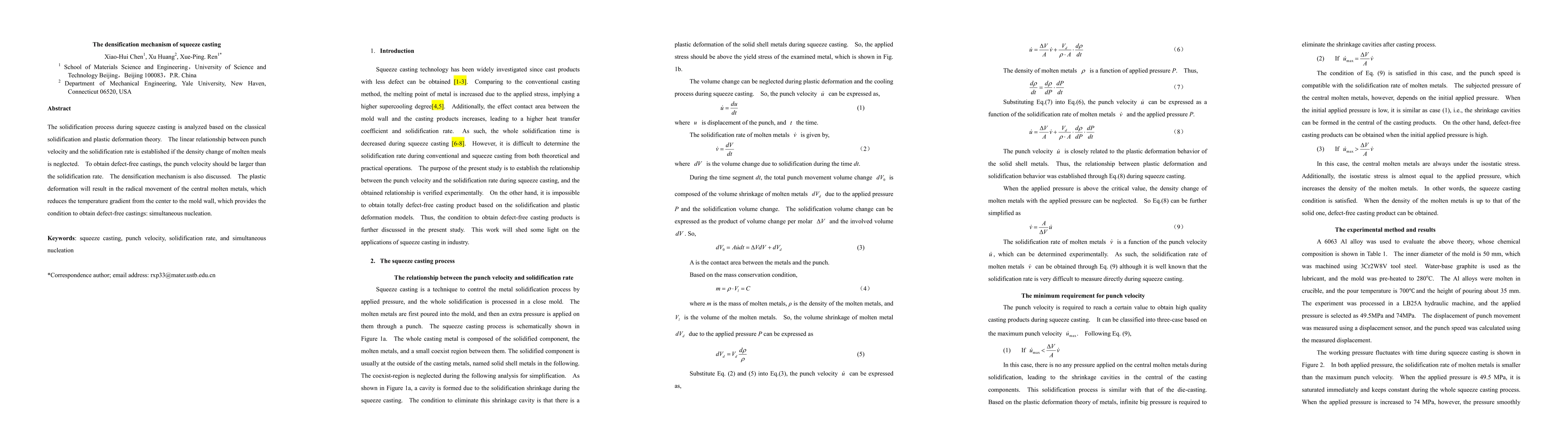 The solidification process during squeeze casting is analyzed based on the classical solidification and plastic deformation theory. The linear relationship between punch velocity and the solidification rate is established if the density change of molten meals is neglected. To obtain defect-free castings, the punch velocity should be larger than the solidification rate. The densification mechanism is also discussed. The plastic deformation will result in the radical movement of the central molten metals, which reduces the temperature gradient from the center to the mold wall, which provides the condition to obtain defect-free castings: simultaneous nucleation.