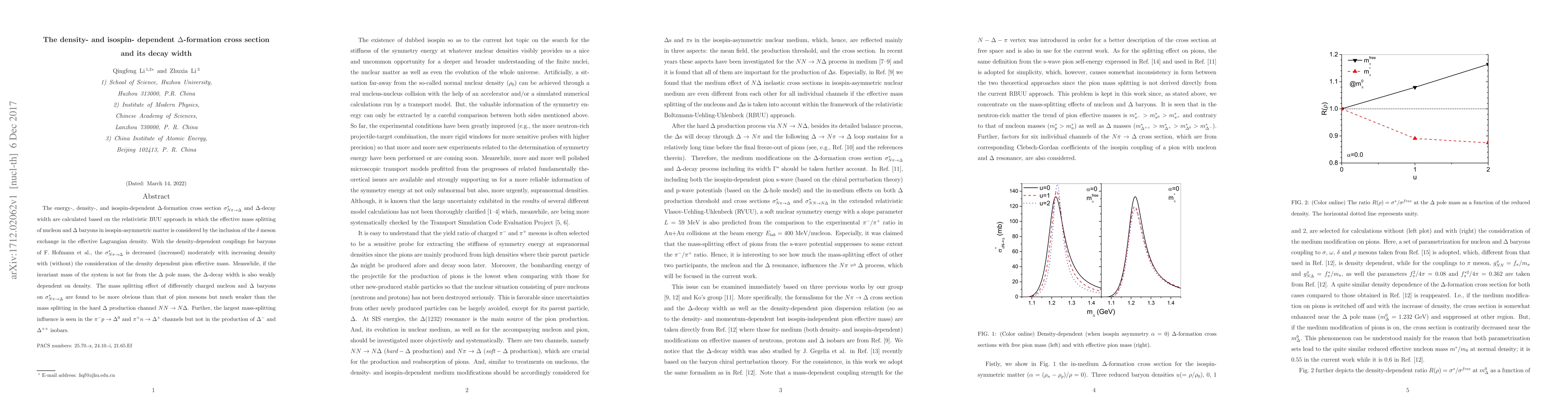 The energy-, density-, and isospin-dependent $\Delta$-formation cross section $\sigma_{N\pi \rightarrow \Delta}^*$ and $\Delta$-decay width are calculated based on the relativistic BUU approach in which the effective mass splitting of nucleon and $\Delta$ baryons in isospin-asymmetric matter is considered by the inclusion of the $\delta$ meson exchange in the effective Lagrangian density. With the density-dependent couplings for baryons of F. Hofmann et al., the $\sigma_{N\pi \rightarrow \Delta}^*$ is decreased (increased) moderately with increasing density with (without) the consideration of the density dependent pion effective mass. Meanwhile, if the invariant mass of the system is not far from the $\Delta$ pole mass, the $\Delta$-decay width is also weakly dependent on density. The mass splitting effect of differently charged nucleon and $\Delta$ baryons on $\sigma_{N\pi \rightarrow \Delta}^*$ are found to be more obvious than that of pion mesons but much weaker than the mass splitting in the hard $\Delta$ production channel $NN\rightarrow N\Delta$. Further, the largest mass-splitting influence is seen in the $\pi^-p\rightarrow \Delta^0$ and $\pi^+n\rightarrow \Delta^+$ channels but not in the production of $\Delta^-$ and $\Delta^{++}$ isobars.