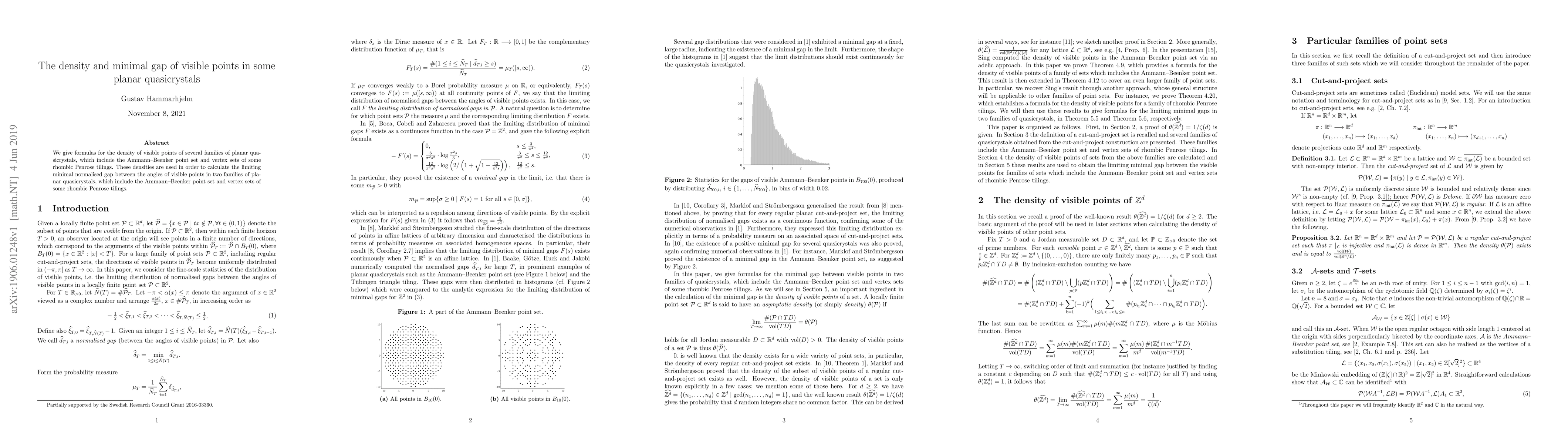 This paper provides formulas for the density of visible points in planar quasicrystals, including the Ammann-Beenker point set and vertex sets of rhombic Penrose tilings, and calculates the minimal normalized gap between the angles of these visible points.