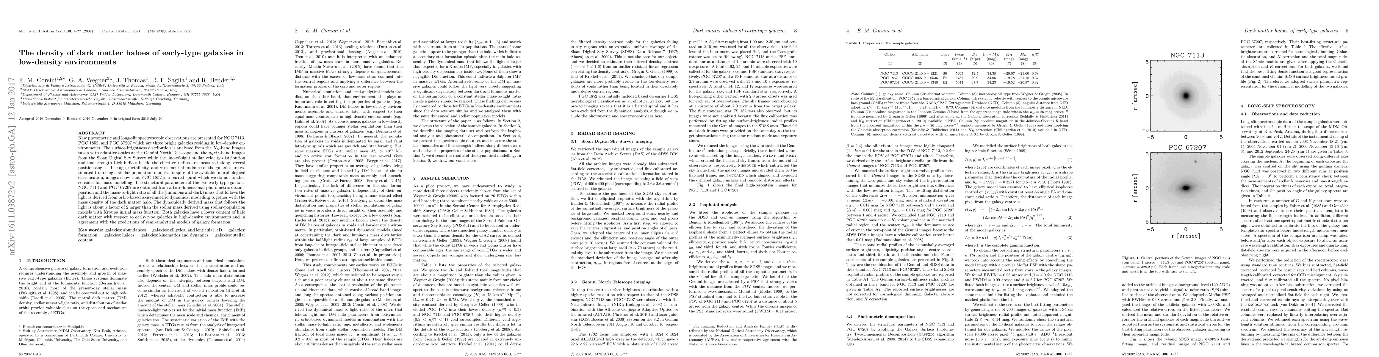 New photometric and long-slit spectroscopic observations are presented for NGC 7113, PGC 1852, and PGC 67207 which are three bright galaxies residing in low-density environments. The surface-brightness distribution is analysed from the K_S-band images taken with adaptive optics at the Gemini North Telescope and the ugriz-band images from the Sloan Digital Sky Survey while the line-of-sight stellar velocity distribution and line-strength Lick indices inside the effective radius are measured along several position angles. The age, metallicity, and alpha-element abundance of the galaxies are estimated from single stellar-population models. In spite of the available morphological classification, images show that PGC 1852 is a barred spiral which we do not further consider for mass modelling. The structural parameters of the two early-type galaxies NGC 7113 and PGC 67207 are obtained from a two-dimensional photometric decomposition and the mass-to-light ratio of all the (luminous and dark) mass that follows the light is derived from orbit-based axisymmetric dynamical modelling together with the mass density of the dark matter halo. The dynamically derived mass that follows the light is about a factor of 2 larger than the stellar mass derived using stellar-population models with Kroupa initial mass function. Both galaxies have a lower content of halo dark matter with respect to early-type galaxies in high-density environments and in agreement with the predictions of semi-analytical models of galaxy formation.