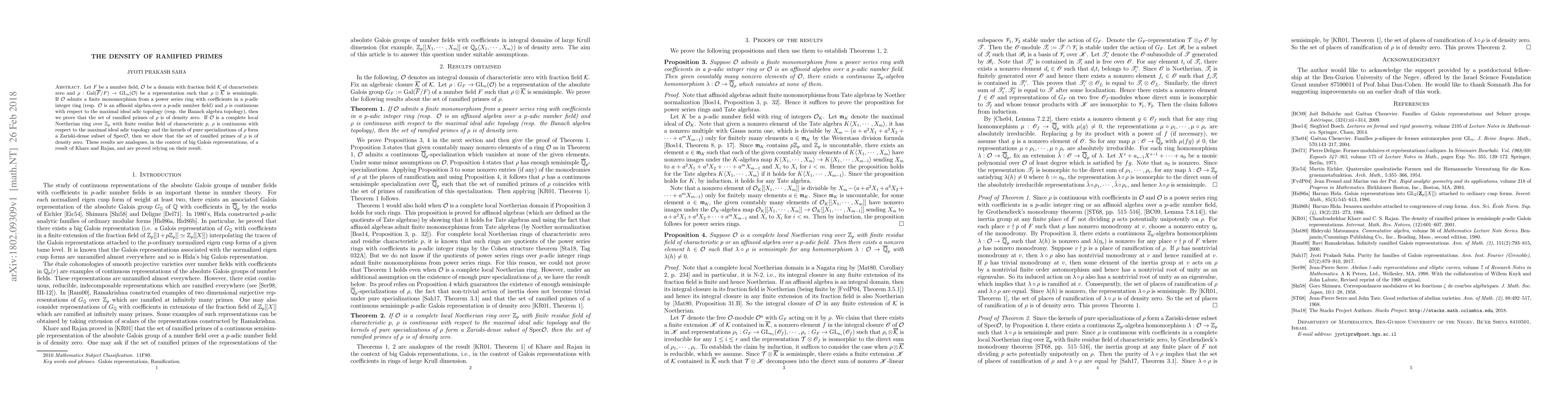Let $F$ be a number field, $\mathcal{O}$ be a domain with fraction field $\mathcal{K}$ of characteristic zero and $\rho: \mathrm{Gal}(\overline F/F) \to \mathrm{GL}_n(\mathcal{O})$ be a representation such that $\rho\otimes\overline{\mathcal{K}}$ is semisimple. If $\mathcal{O}$ admits a finite monomorphism from a power series ring with coefficients in a $p$-adic integer ring (resp. $\mathcal{O}$ is an affinoid algebra over a $p$-adic number field) and $\rho$ is continuous with respect to the maximal ideal adic topology (resp. the Banach algebra topology), then we prove that the set of ramified primes of $\rho$ is of density zero. If $\mathcal{O}$ is a complete local Noetherian ring over $\mathbb{Z}_p$ with finite residue field of characteristic $p$, $\rho$ is continuous with respect to the maximal ideal adic topology and the kernels of pure specializations of $\rho$ form a Zariski-dense subset of $\mathrm{Spec} \mathcal{O}$, then we show that the set of ramified primes of $\rho$ is of density zero. These results are analogues, in the context of big Galois representations, of a result of Khare and Rajan, and are proved relying on their result.