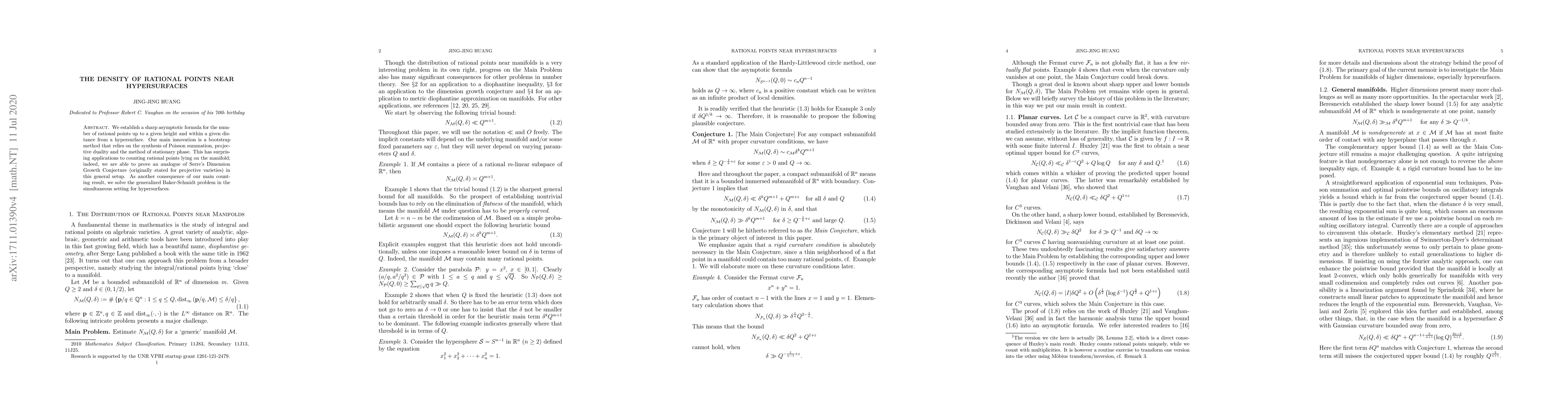 This paper develops a sharp asymptotic formula for rational points near hypersurfaces using a novel bootstrap method combining Poisson summation, projective duality, and stationary phase. It also proves an analogue of Serre's Dimension Growth Conjecture and an optimal Jarník type theorem for simultaneous approximation on hypersurfaces.