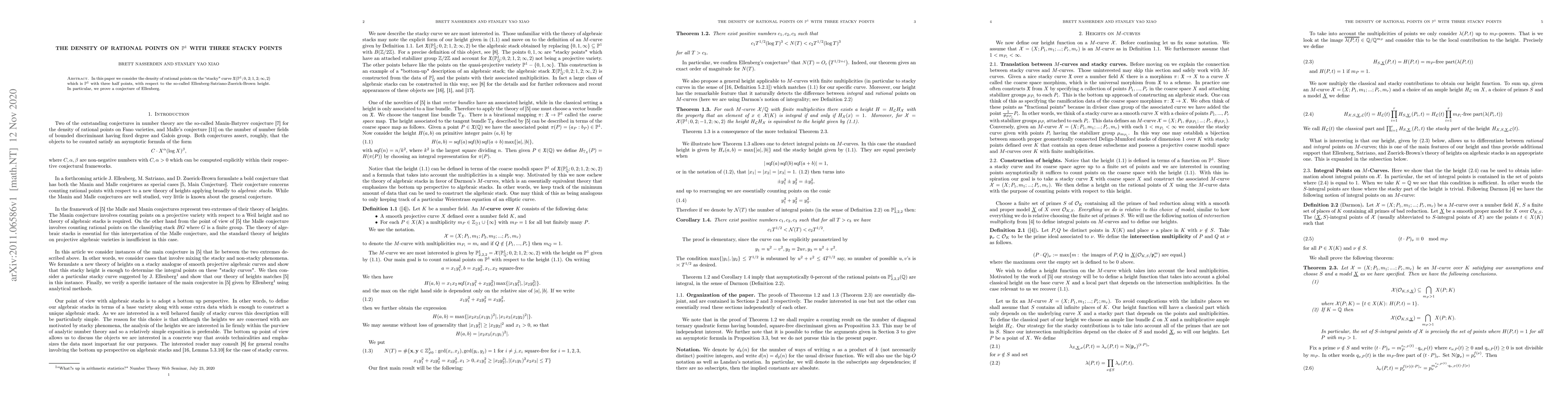 This paper investigates the density of rational points on the stacky curve $\mathcal{X}(\mathbb{P}^1;0,2;1,2;\infty,2)$, focusing on $\mathbb{P}^1$ with three stacky points, and proves a conjecture by Ellenberg using the Ellenberg-Satriano-Zuerick-Brown height metric.