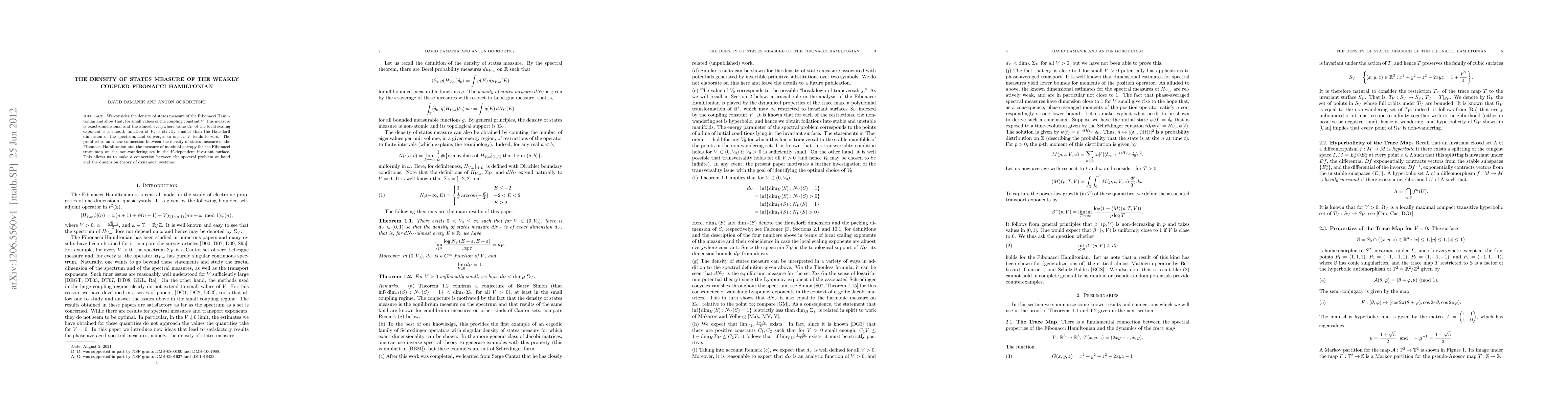 We consider the density of states measure of the Fibonacci Hamiltonian and show that, for small values of the coupling constant $V$, this measure is exact-dimensional and the almost everywhere value $d_V$ of the local scaling exponent is a smooth function of $V$, is strictly smaller than the Hausdorff dimension of the spectrum, and converges to one as $V$ tends to zero. The proof relies on a new connection between the density of states measure of the Fibonacci Hamiltonian and the measure of maximal entropy for the Fibonacci trace map on the non-wandering set in the $V$-dependent invariant surface. This allows us to make a connection between the spectral problem at hand and the dimension theory of dynamical systems.