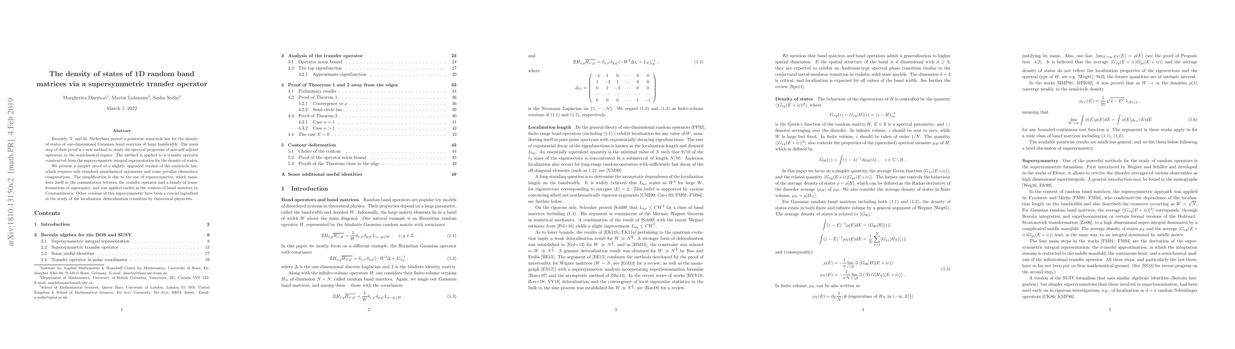 This paper presents a simplified proof of an upgraded semicircle law for the density of states of 1D random band matrices using supersymmetry. The method leverages the commutation between the transfer operator and transformations of superspace, which simplifies the analysis compared to previous methods.