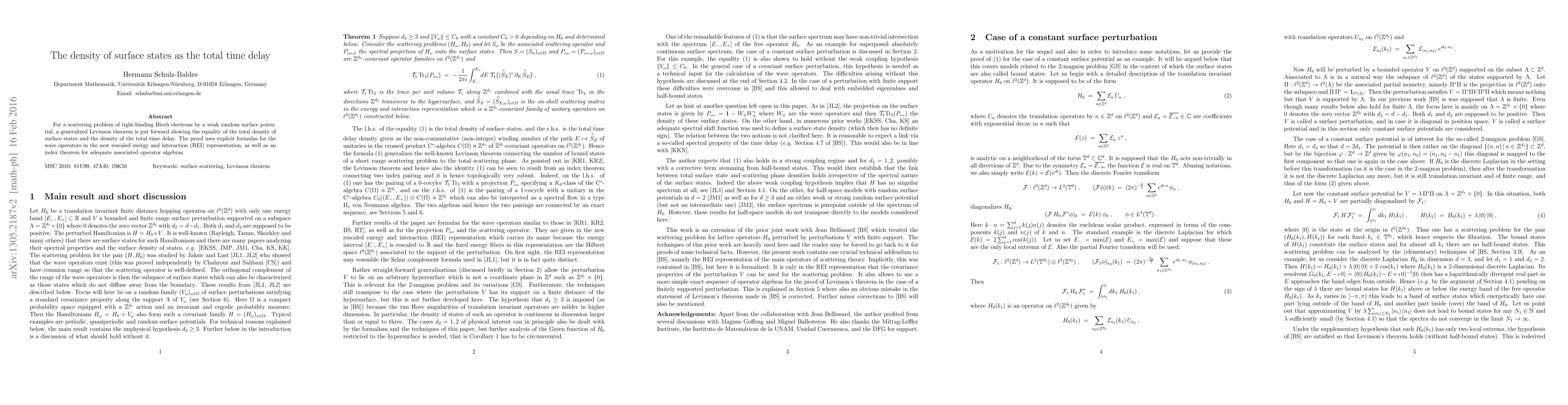For a scattering problem of tight-binding Bloch electrons by a weak random surface potential, a generalized Levinson theorem is put forward showing the equality of the total density of surface states and the density of the total time delay. The proof uses explicit formulas for the wave operators in the new rescaled energy and interaction (REI) representation, as well as an index theorem for adequate associated operator algebras.