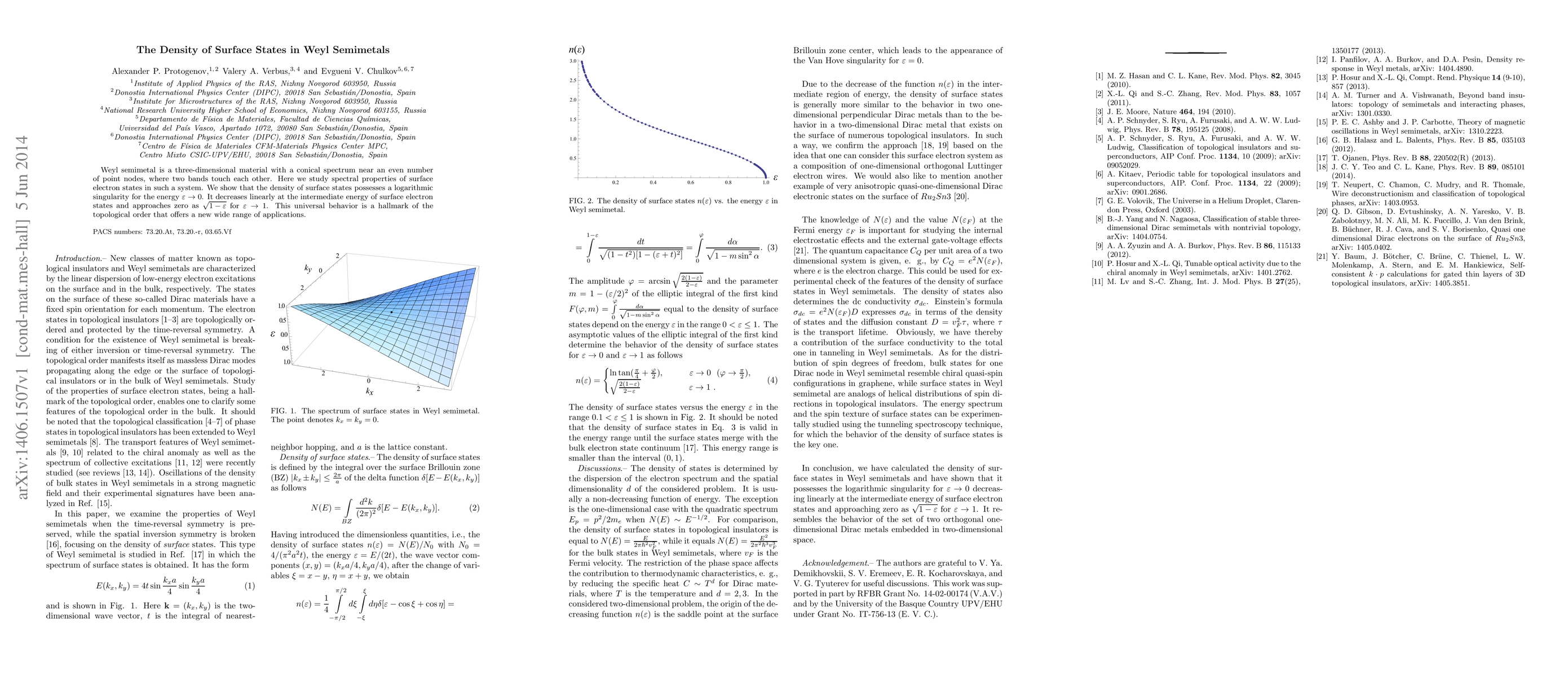 This paper investigates the spectral properties of surface electron states in Weyl semimetals, revealing a unique density of states with a logarithmic singularity near zero energy and a linear decrease at intermediate energies, ultimately approaching zero as $\sqrt{1-\varepsilon}$ near the energy maximum, highlighting a topological feature with potential applications.
