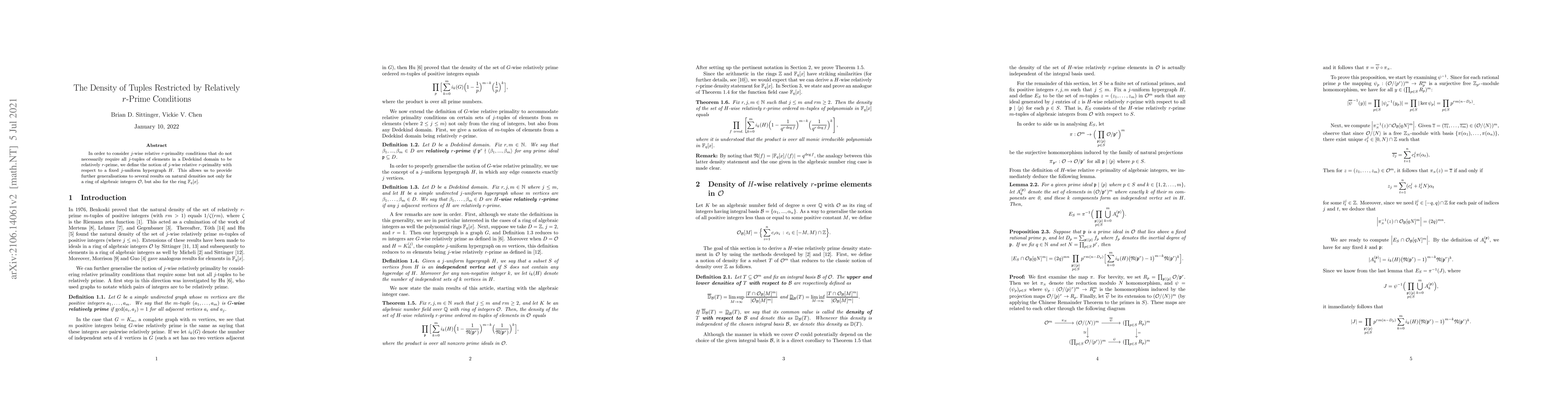 This paper introduces the concept of j-wise relative r-primality within a Dedekind domain, defined via a j-uniform hypergraph, to generalize density results for algebraic integers and polynomials over finite fields. The approach relaxes the requirement of all j-tuples being relatively r-prime.