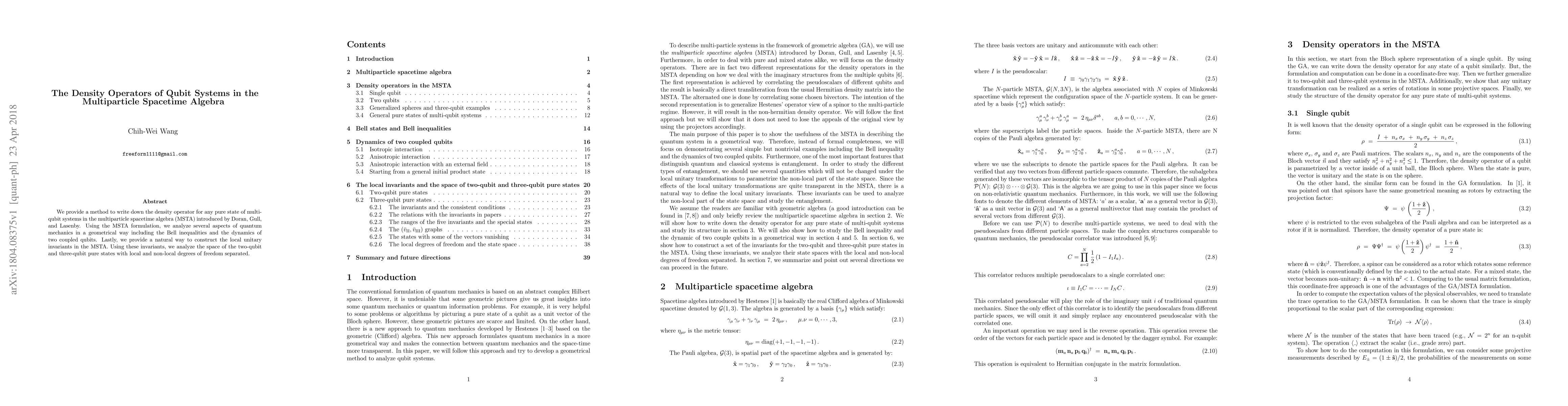 We provide a method to write down the density operator for any pure state of multi-qubit systems in the multiparticle spacetime algebra (MSTA) introduced by Doran, Gull, and Lasenby. Using the MSTA formulation, we analyze several aspects of quantum mechanics in a geometrical way including the Bell inequality and the dynamics of two coupled qubits. Lastly, we provide a natural way to construct the local unitary invariants in the MSTA. Using these invariants, we analyze the space of the two-qubit and three-qubit pure states with local and non-local degrees of freedom separated.