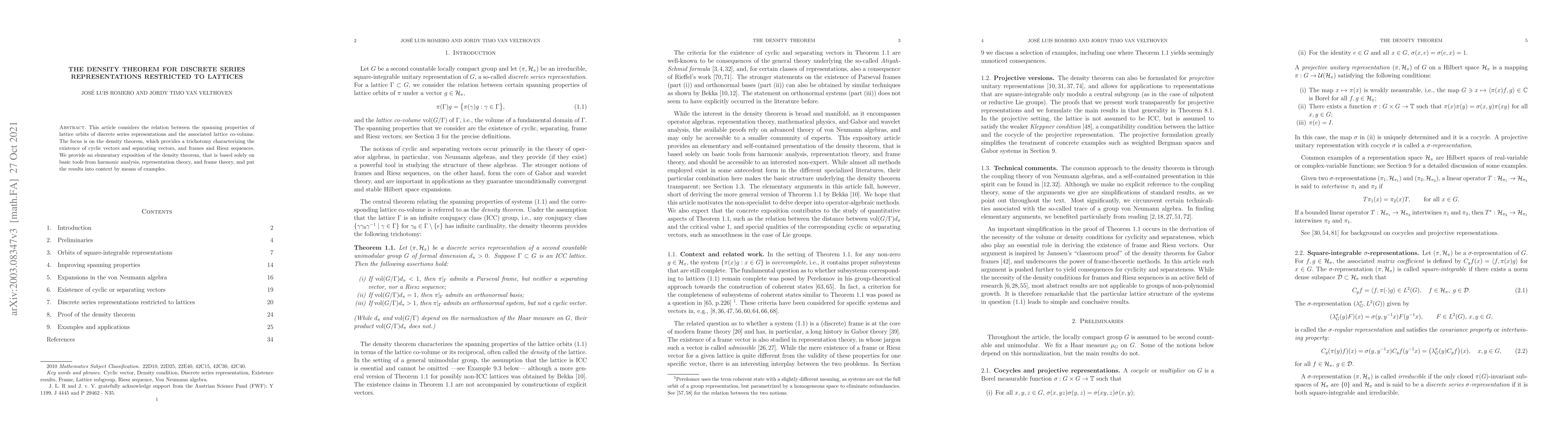 This article considers the relation between the spanning properties of lattice orbits of discrete series representations and the associated lattice co-volume. The focus is on the density theorem, which provides a trichotomy characterizing the existence of cyclic vectors and separating vectors, and frames and Riesz sequences. We provide an elementary exposition of the density theorem, that is based solely on basic tools from harmonic analysis, representation theory, and frame theory, and put the results into context by means of examples.