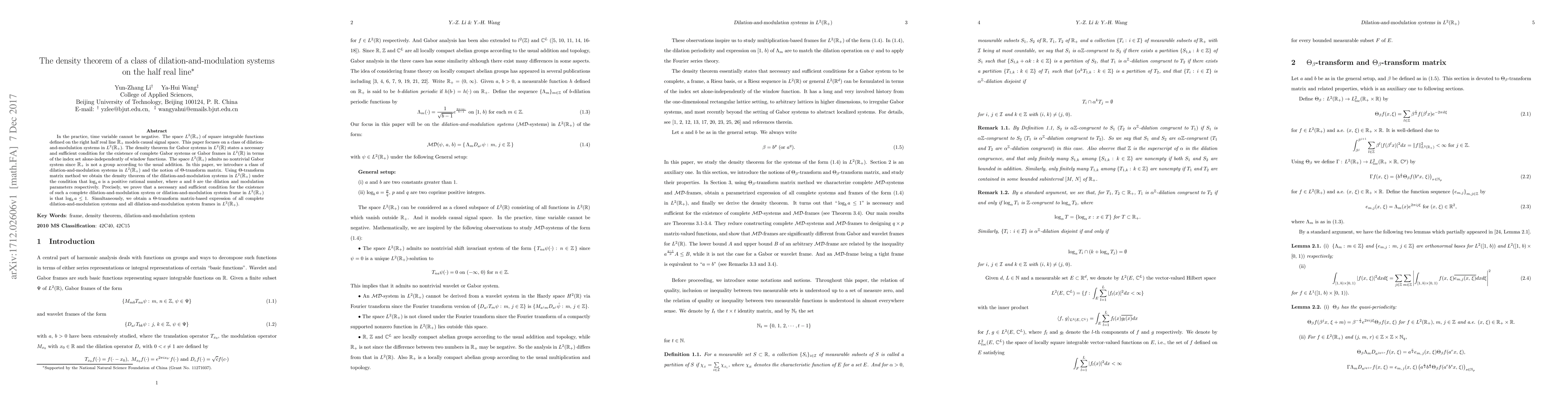In the practice, time variable cannot be negative. The space $L^2(\Bbb R_+)$ of square integrable functions defined on the right half real line $\Bbb R_+$ models causal signal space. This paper focuses on a class of dilation-and-modulation systems in $L^2(\Bbb R_+)$. The density theorem for Gabor systems in $L^2(\Bbb R)$ states a necessary and sufficient condition for the existence of complete Gabor systems or Gabor frames in $L^2(\Bbb R)$ in terms of the index set alone-independently of window functions. The space $L^2(\Bbb R_+)$ admits no nontrivial Gabor system since $\Bbb R_+$ is not a group according to the usual addition. In this paper, we introduce a class of dilation-and-modulation systems in $L^2(\Bbb R_+)$ and the notion of $\Theta$-transform matrix. Using $\Theta$-transform matrix method we obtain the density theorem of the dilation-and-modulation systems in $L^2(\Bbb R_+)$ under the condition that $\log_ba$ is a positive rational number, where $a$ and $b$ are the dilation and modulation parameters respectively. Precisely, we prove that a necessary and sufficient condition for the existence of such a complete dilation-and-modulation system or dilation-and-modulation system frame in $L^2(\Bbb R_+)$ is that $\log_ba \leq 1$. Simultaneously, we obtain a $\Theta$-transform matrix-based expression of all complete dilation-and-modulation systems and all dilation-and-modulation system frames in $L^2(\Bbb R_+)$.
