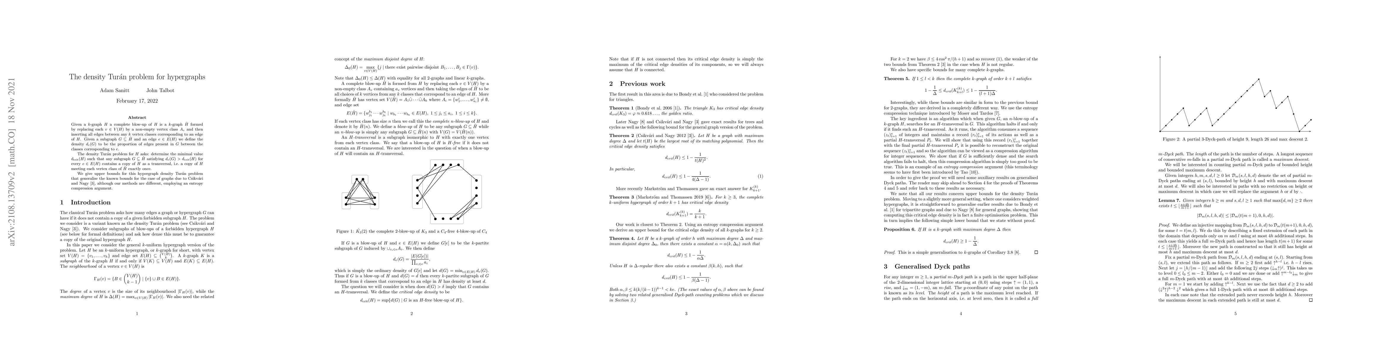 Given a $k$-graph $H$ a complete blow-up of $H$ is a $k$-graph $\hat{H}$ formed by replacing each $v\in V(H)$ by a non-empty vertex class $A_v$ and then inserting all edges between any $k$ vertex classes corresponding to an edge of $H$. Given a subgraph $G\subseteq \hat{H}$ and an edge $e\in E(H)$ we define the density $d_e(G)$ to be the proportion of edges present in $G$ between the classes corresponding to $e$. The density Tur\'an problem for $H$ asks: determine the minimal value $d_{crit}(H)$ such that any subgraph $G\subseteq \hat{H}$ satisfying $d_e(G)> d_{crit}(H)$ for every $e\in E(H)$ contains a copy of $H$ as a transversal, i.e. a copy of $H$ meeting each vertex class of $\hat{H}$ exactly once. We give upper bounds for this hypergraph density Tur\'an problem that generalise the known bounds for the case of graphs due to Csikv\'ari and Nagy, [Combinatorics, Probability and Computing, 21(4):531-553, 2012] although our methods are different, employing an entropy compression argument.