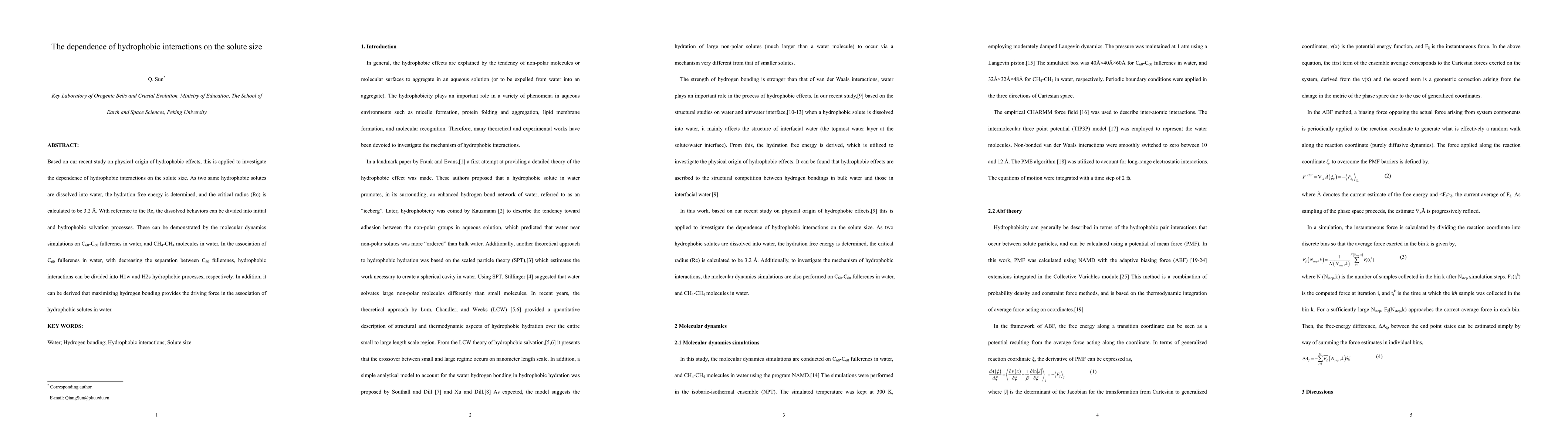 Based on our recent study on physical origin of hydrophobic effects, this is applied to investigate the dependence of hydrophobic interactions on the solute size. As two same hydrophobic solutes are dissolved into water, the hydration free energy is determined, and the critical radius (Rc) is calculated to be 3.2 Angstrom. With reference to the Rc, the dissolved behaviors can be divided into initial and hydrophobic solvation processes. These can be demonstrated by the molecular dynamics simulations on C60-C60 fullerenes in water, and CH4-CH4 molecules in water. In the association of C60 fullerenes in water, with decreasing the separation between C60 fullerenes, hydrophobic interactions can be divided into H1w and H2s hydrophobic processes, respectively. In addition, it can be derived that maximizing hydrogen bonding provides the driving force in the association of hydrophobic solutes in water.