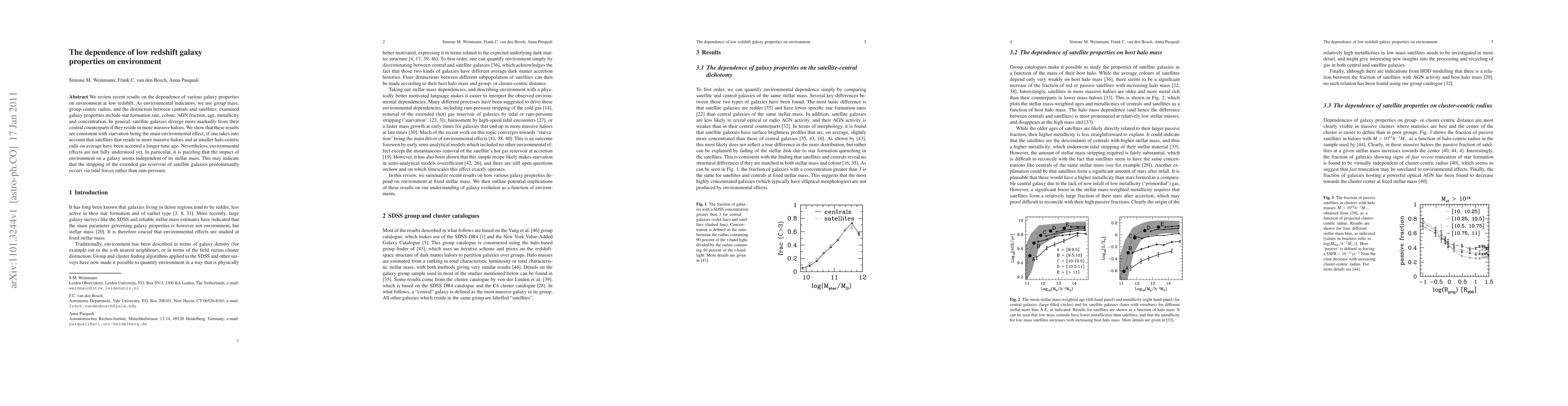 This paper reviews how low-redshift galaxy properties like star formation rate, color, and AGN fraction vary with environment, finding that satellite galaxies in more massive haloes show greater divergence from central galaxies, suggesting starvation as a key effect. However, the environment's impact on galaxies is still not fully understood, especially since it appears independent of stellar mass, hinting at tidal forces over ram-pressure stripping.