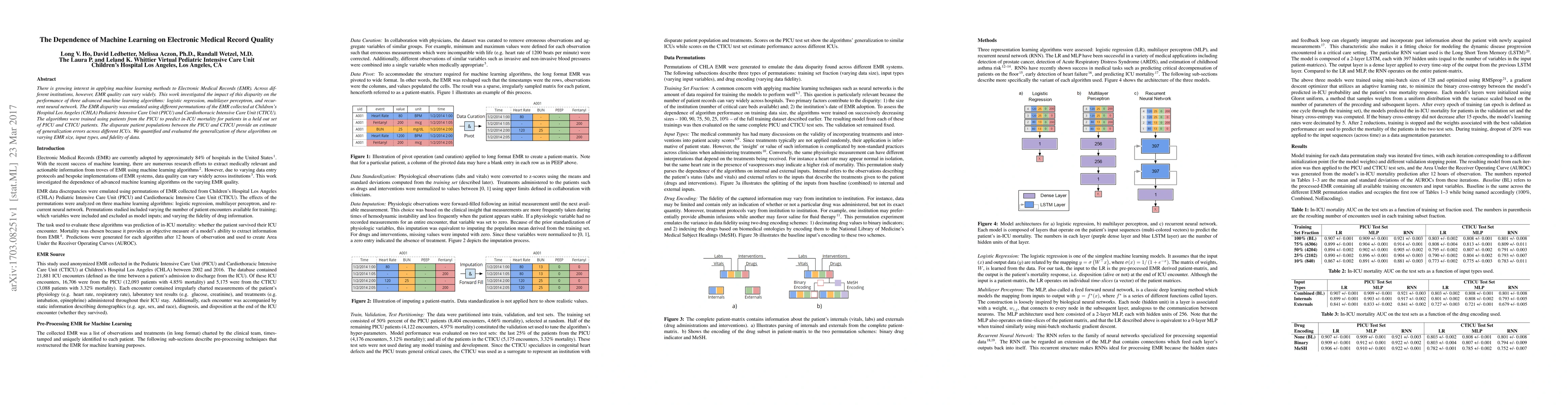 There is growing interest in applying machine learning methods to Electronic Medical Records (EMR). Across different institutions, however, EMR quality can vary widely. This work investigated the impact of this disparity on the performance of three advanced machine learning algorithms: logistic regression, multilayer perceptron, and recurrent neural network. The EMR disparity was emulated using different permutations of the EMR collected at Children's Hospital Los Angeles (CHLA) Pediatric Intensive Care Unit (PICU) and Cardiothoracic Intensive Care Unit (CTICU). The algorithms were trained using patients from the PICU to predict in-ICU mortality for patients in a held out set of PICU and CTICU patients. The disparate patient populations between the PICU and CTICU provide an estimate of generalization errors across different ICUs. We quantified and evaluated the generalization of these algorithms on varying EMR size, input types, and fidelity of data.