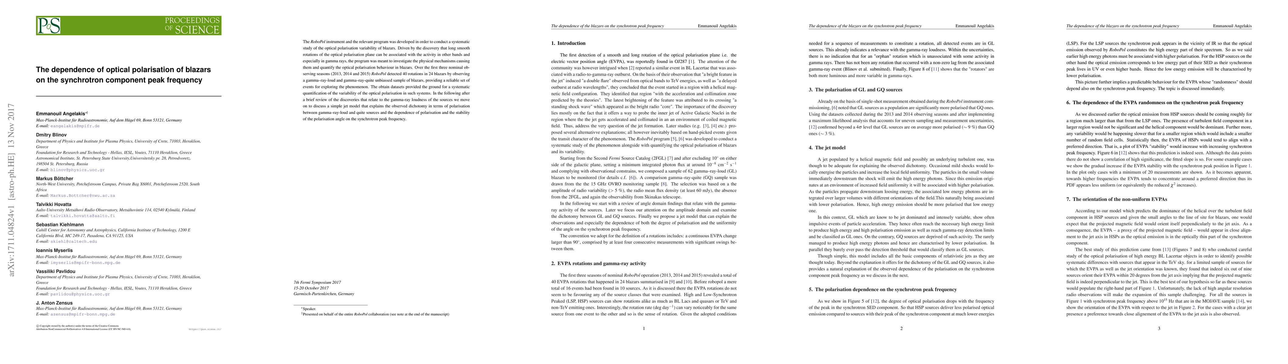 This paper investigates the optical polarisation variability of blazars using the RoboPol instrument, finding 40 rotations in 24 blazars over three observing seasons. It explores a jet model explaining the polarisation differences between gamma-ray-loud and quiet blazars, linking polarisation stability to the synchrotron component peak frequency.
