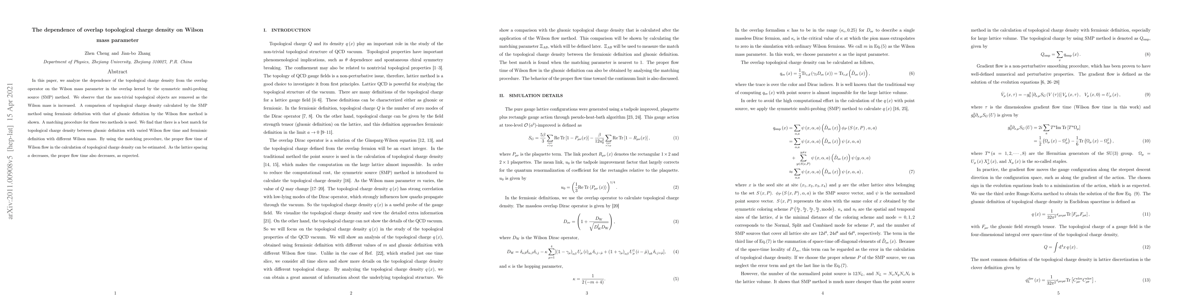 In this paper, we analyze the dependence of the topological charge density from the overlap operator on the Wilson mass parameter in the overlap kernel by the symmetric multi-probing source (SMP) method. We observe that the non-trivial topological objects are removed as the Wilson mass is increased. A comparison of topological charge density calculated by the SMP method using fermionic definition with that of gluonic definition by the Wilson flow method is shown. A matching procedure for these two methods is used. We find that there is a best match for topological charge density between gluonic definition with varied Wilson flow time and fermionic definition with different Wilson mass. By using the matching procedure, the proper flow time of Wilson flow in the calculation of topological charge density can be estimated. As the lattice spacing $a$ decreases, the proper flow time also decreases, as expected.