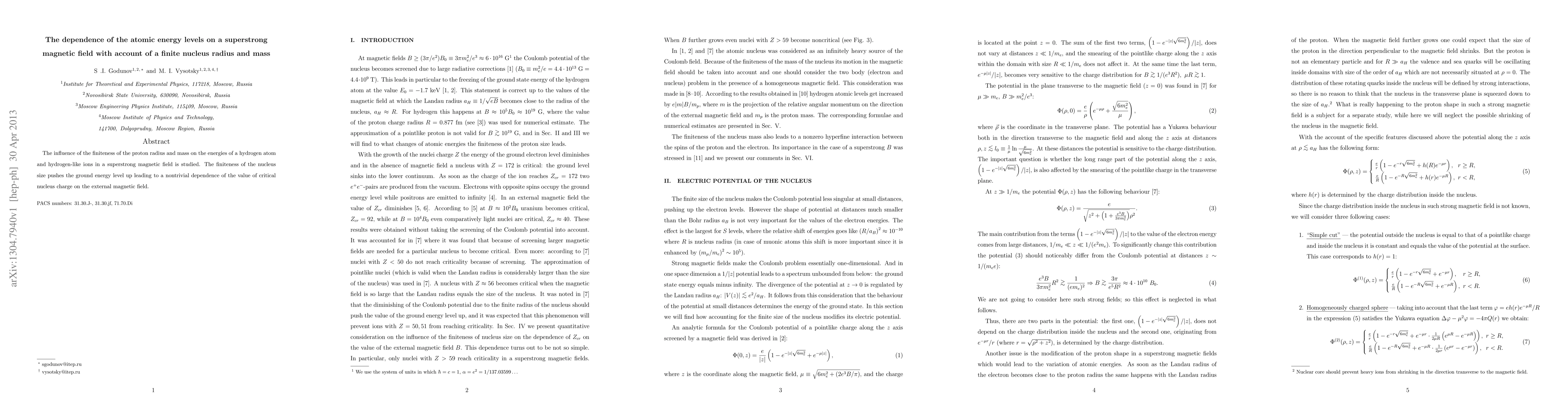 Summary: This paper investigates the impact of finite proton radius and mass on hydrogen atom and hydrogen-like ions' energy levels under superstrong magnetic fields, revealing a shift in the ground energy level and a complex dependence of critical nucleus charge on the external magnetic field.